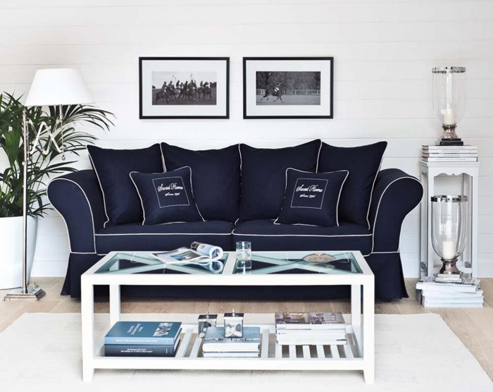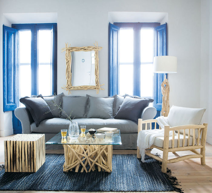 Следващите снимки ще ви покажат още дървено дюшеме, синьо-бели кресла и дивани, декорации по възглавниците на меката мебел – мирис на лято и море. Подберете акценти с въже, бамбук и тръстикови клони и няма да сгрешите.