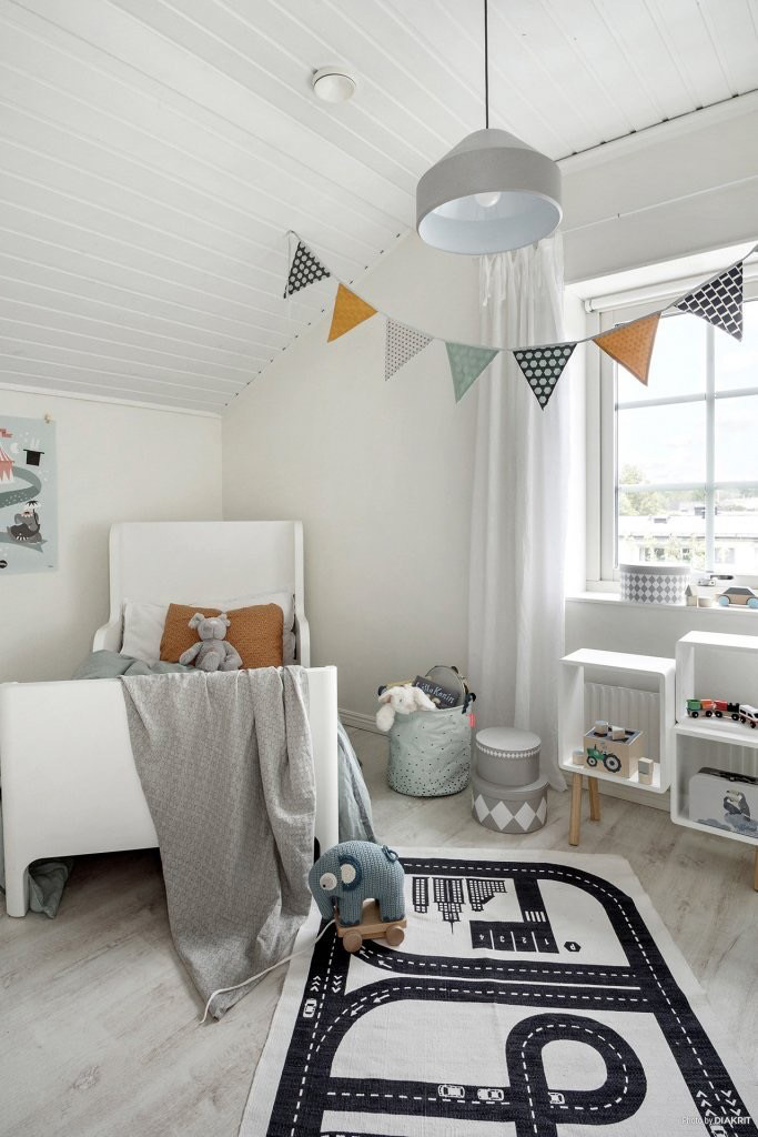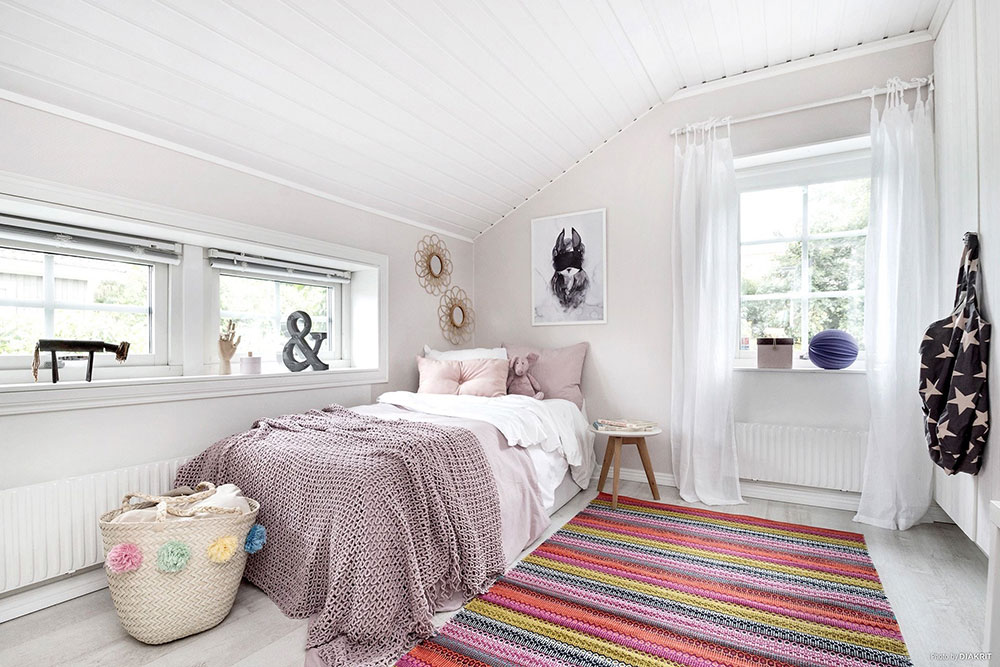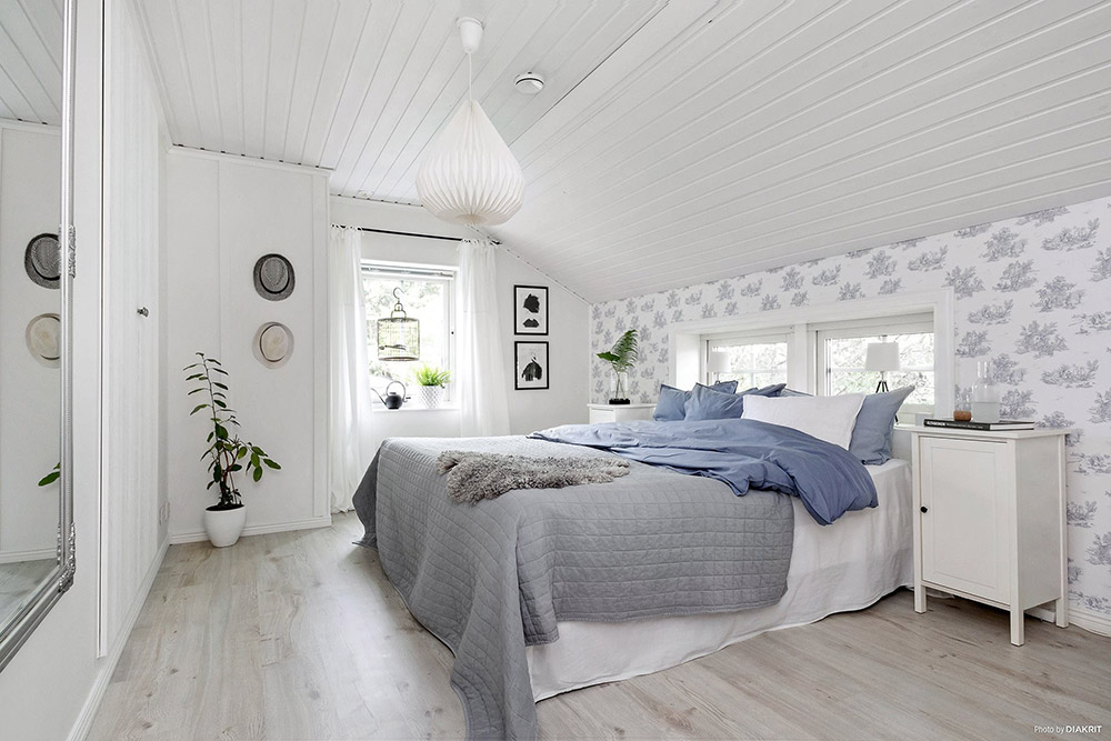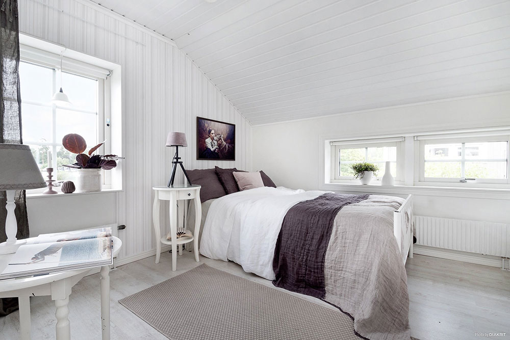 На горния етаж са разположени родителска спалня и три детски стаи, всички със скосени тавани.