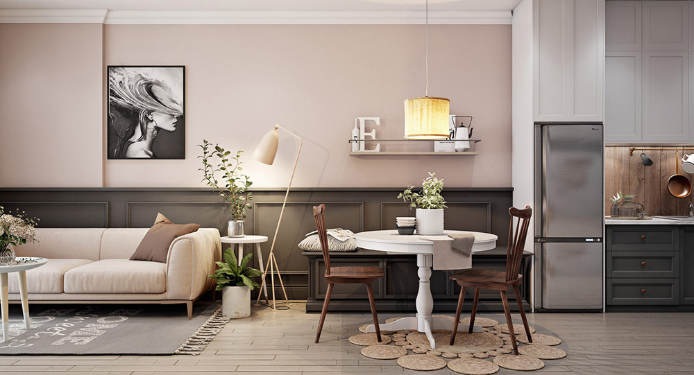 Компактен, изискан и комфортен, този малък апартамент ни показва чудесните възможности за умело усвояване на неголеми пространства с помощта на пастелните тонове и женствени детайли.