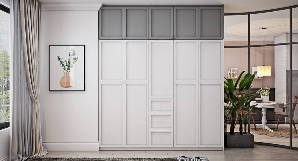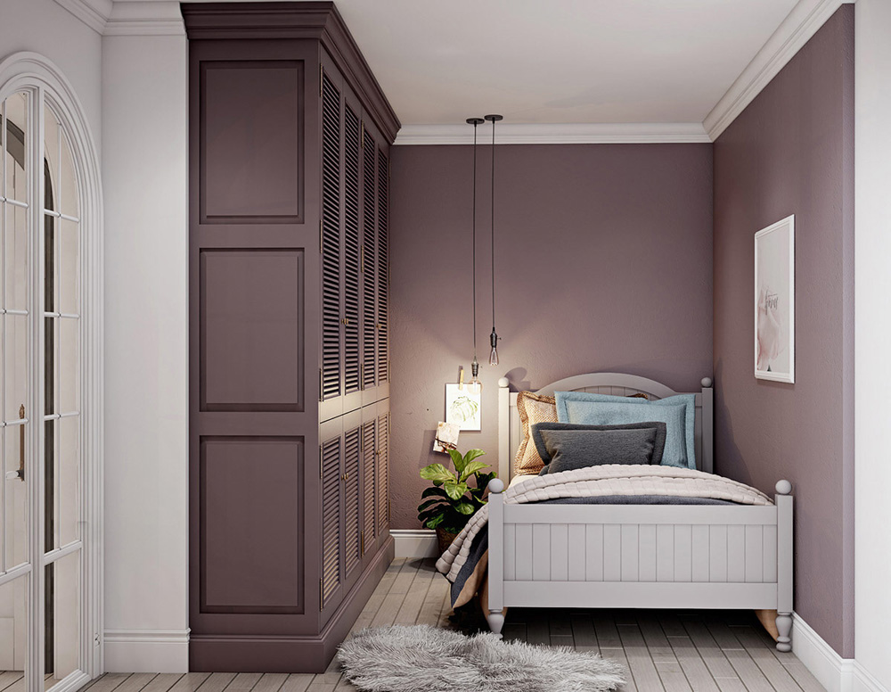 Зад стъклената преграда се намира голяма спалня с поръчков гардероб в бяло и сиво, играещ ролята и на преграждаща стена към всекидневната, което е още един пример за умело усвоено пространство. Спалнята е женствена, обзаведена с подчертан финес и акценти в пепел от рози. Елегантната тоалетка с огледало, вмъкната в малък кът до леглото, дава възможност да бъде ползвана и като работно бюро.