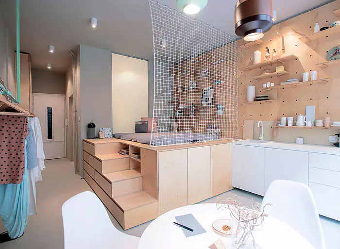 Свежият и артистичен дизайн на това малко студио гарантира комфорт и функционалност. Необичайното използване на пространството с цел увеличаване на възможностите за съхранение е отличен избор за малки пространства.