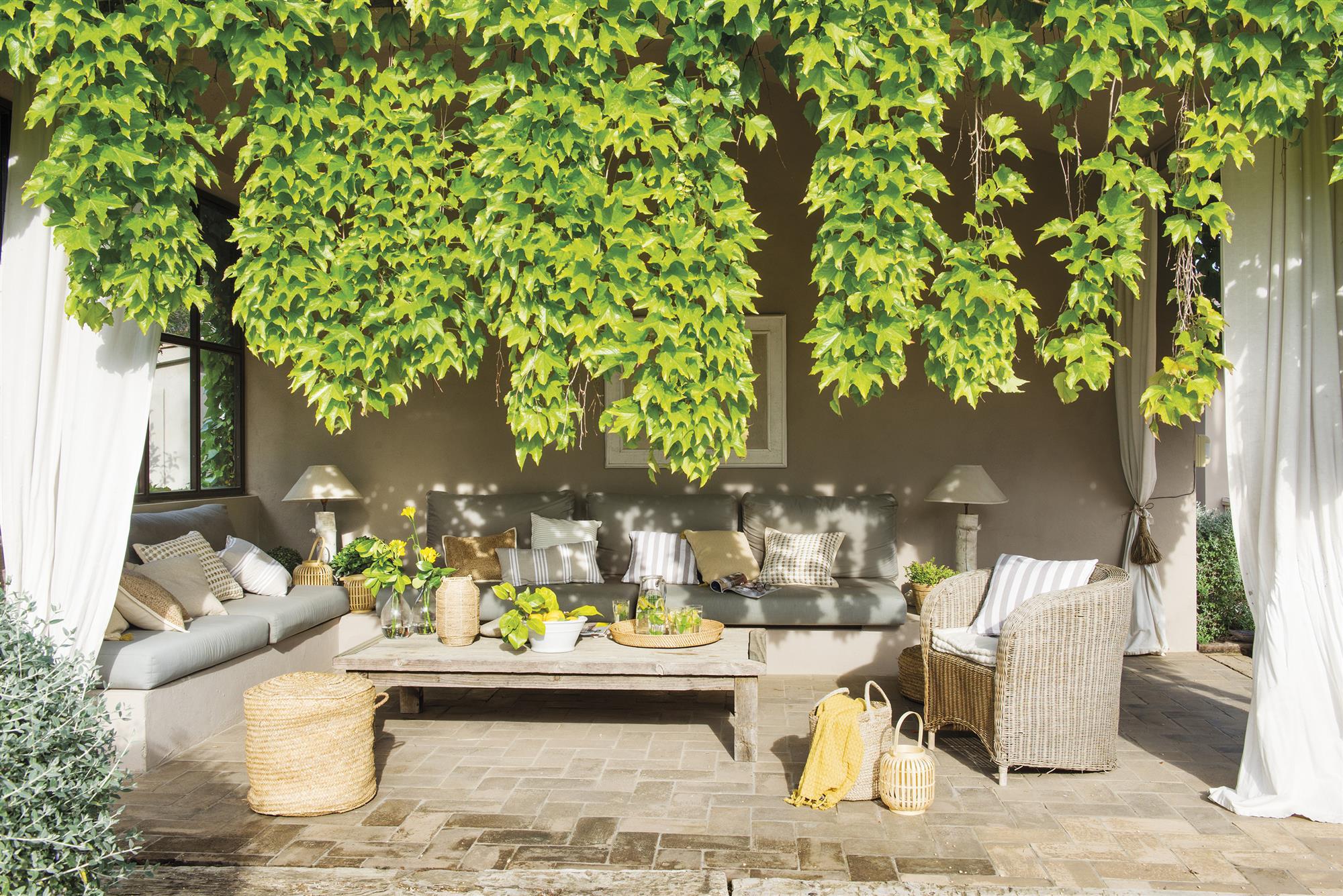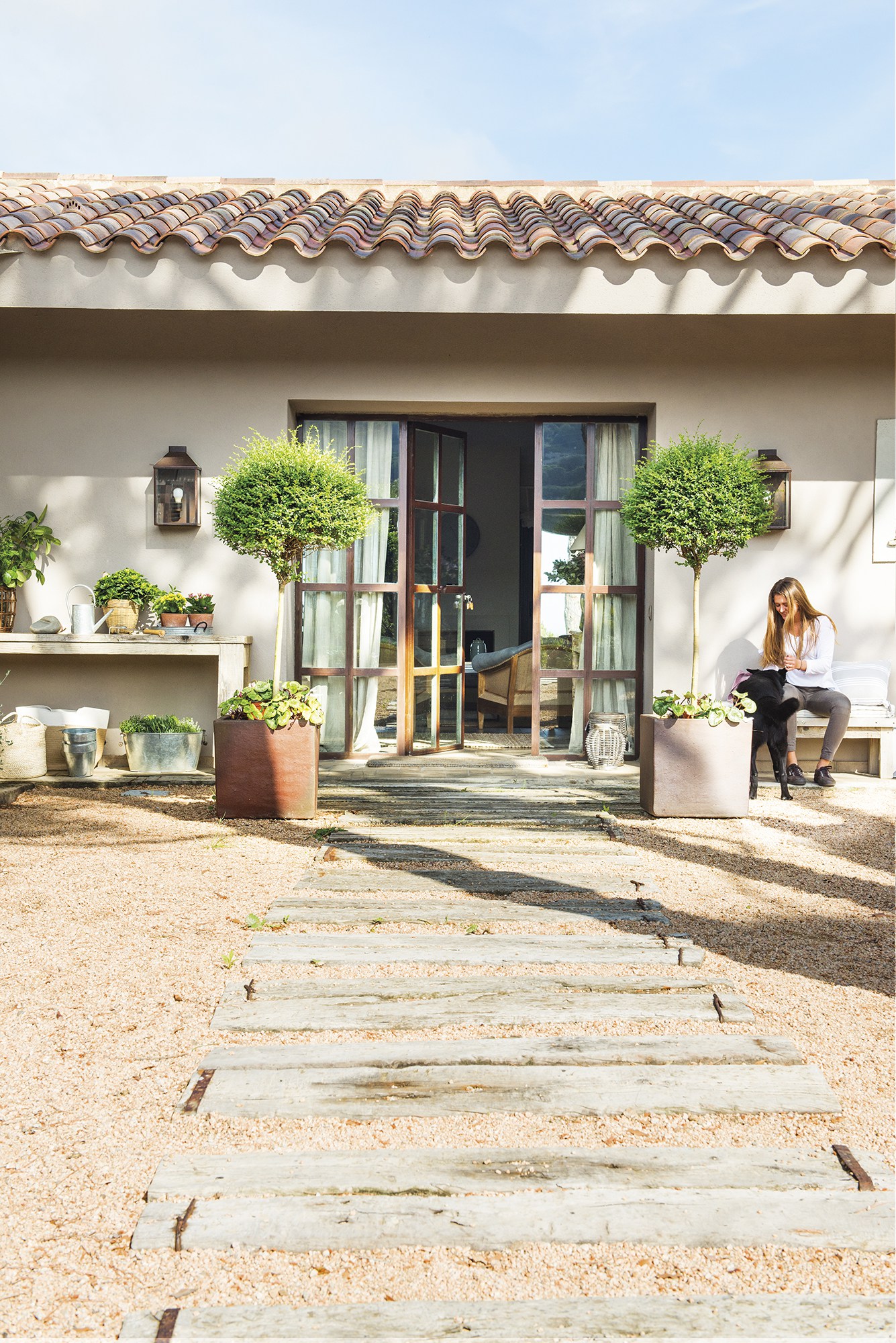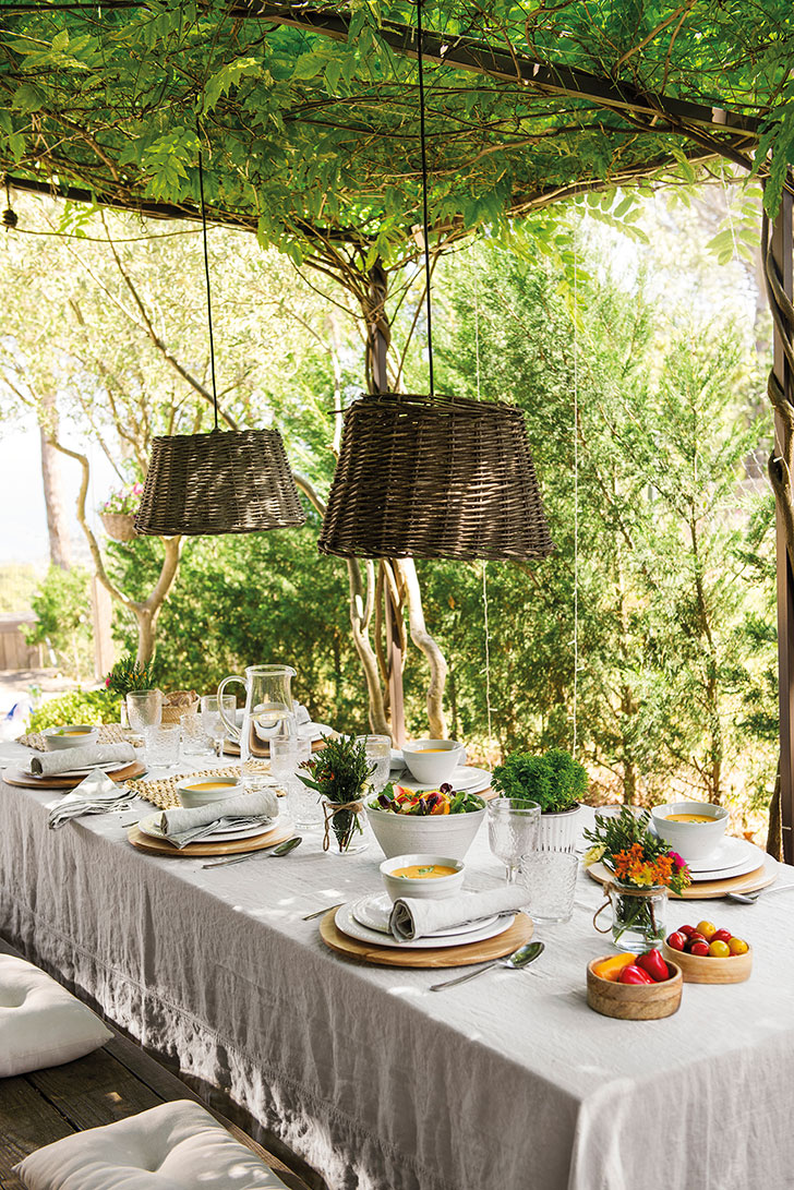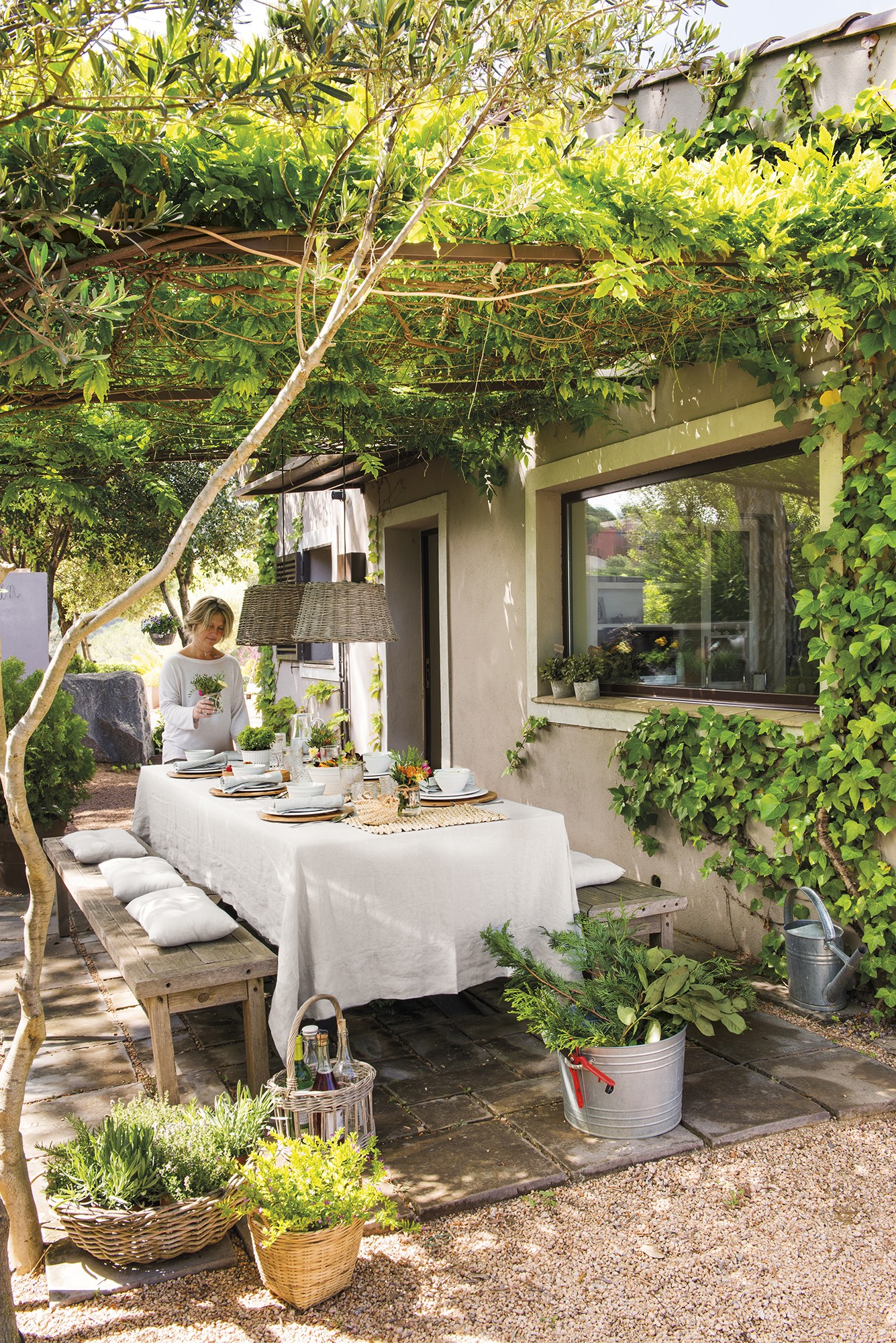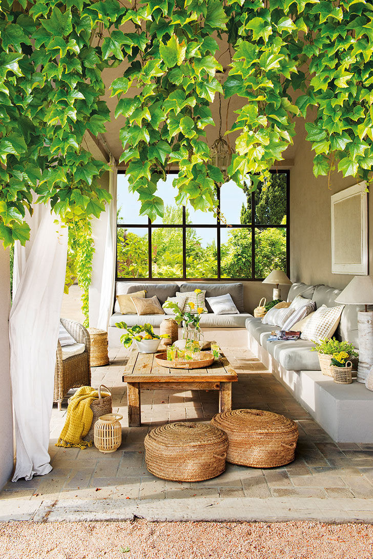 Вечнозелени увивни растения пълзят по продължението на стените и обособения навес. Масата е голяма и масивна – отлично решение за голяма компания. Скованите пейки с меки възглавнички и плетените полилеи са част от уникалната рустик визия на дворното пространство. Зеленината наоколо само подсилва въздействието. Чакъл, дървени греди, кована стълба и хамак на дървото. Колко малко му трябва на човек, за да се почувства щастлив на село.