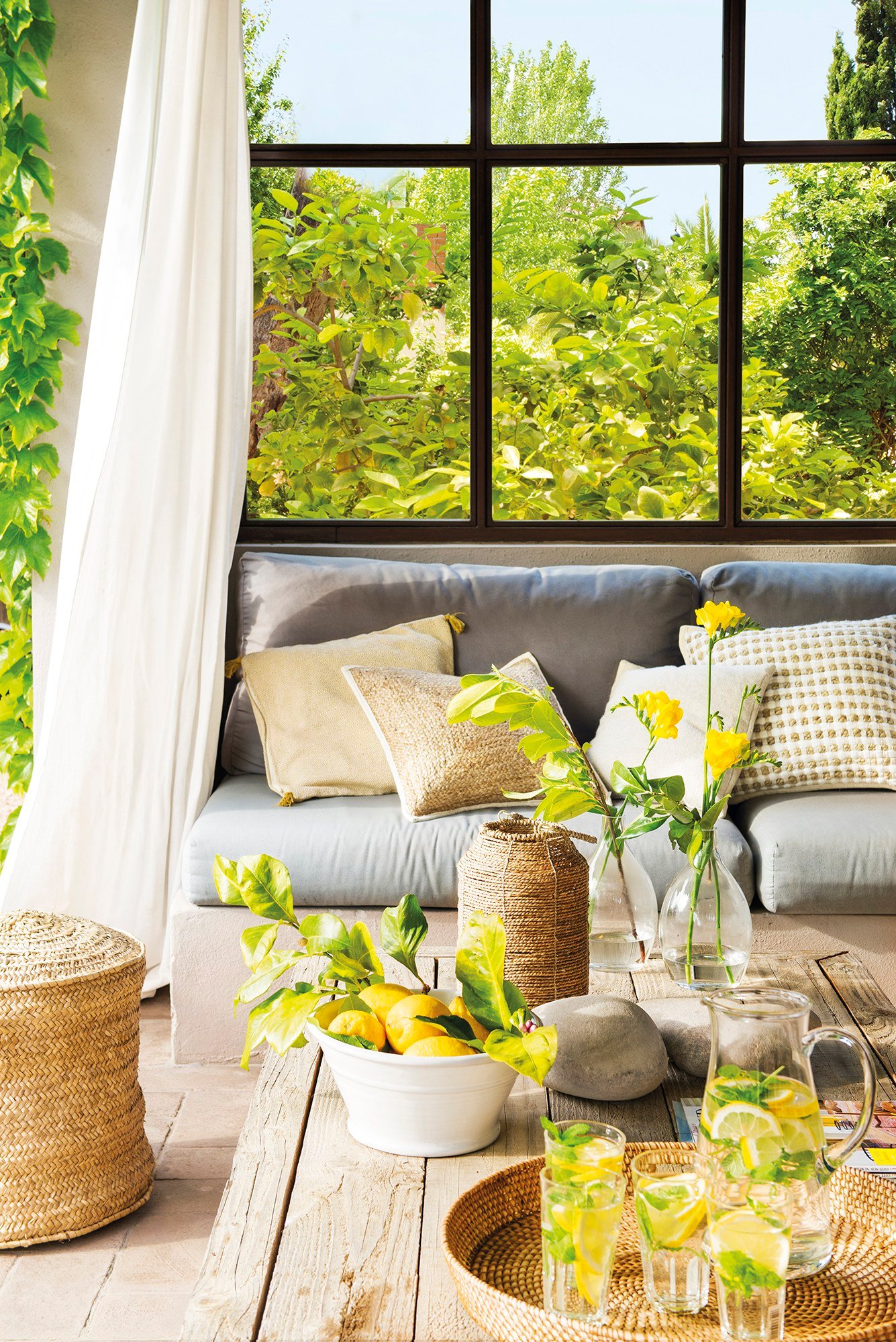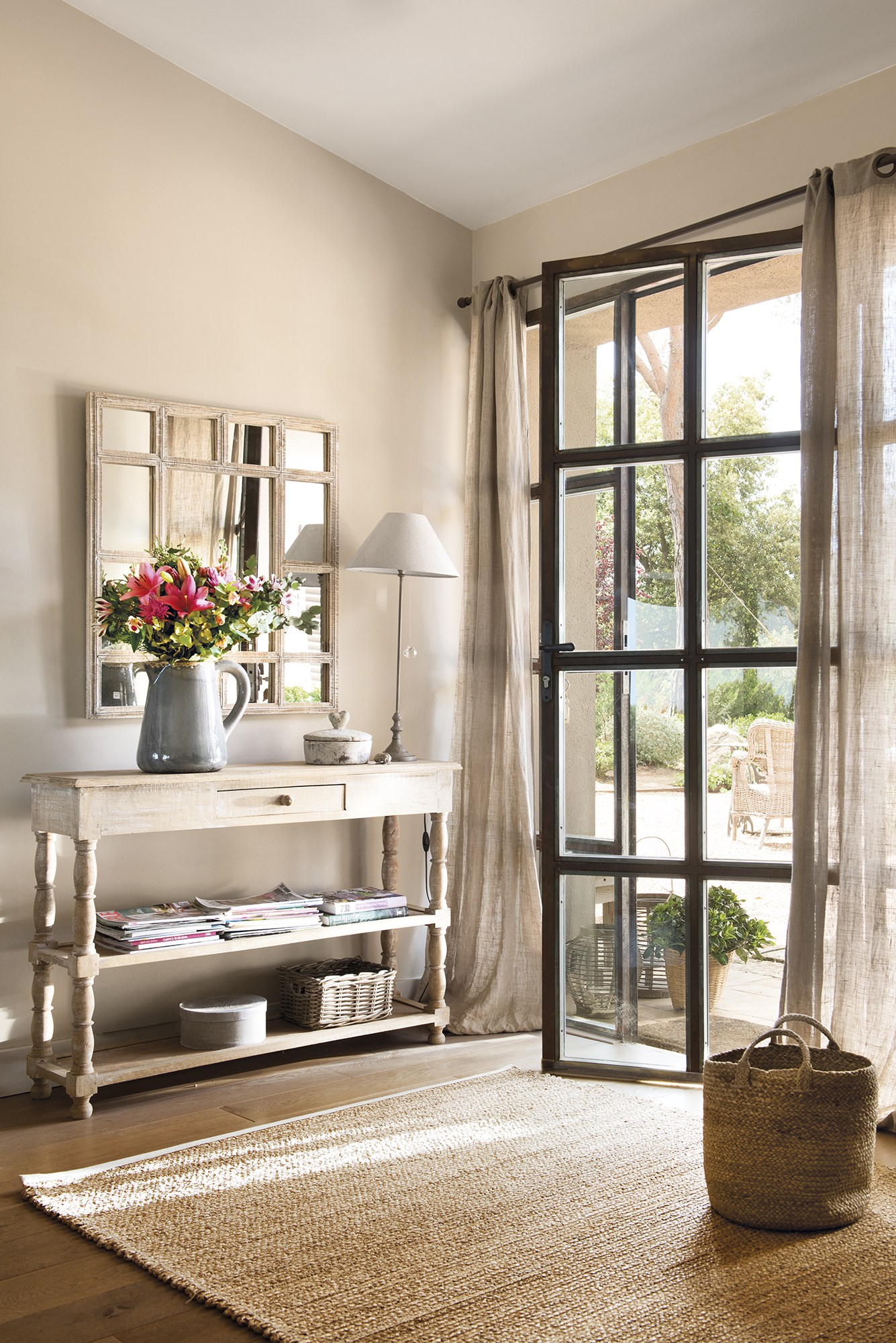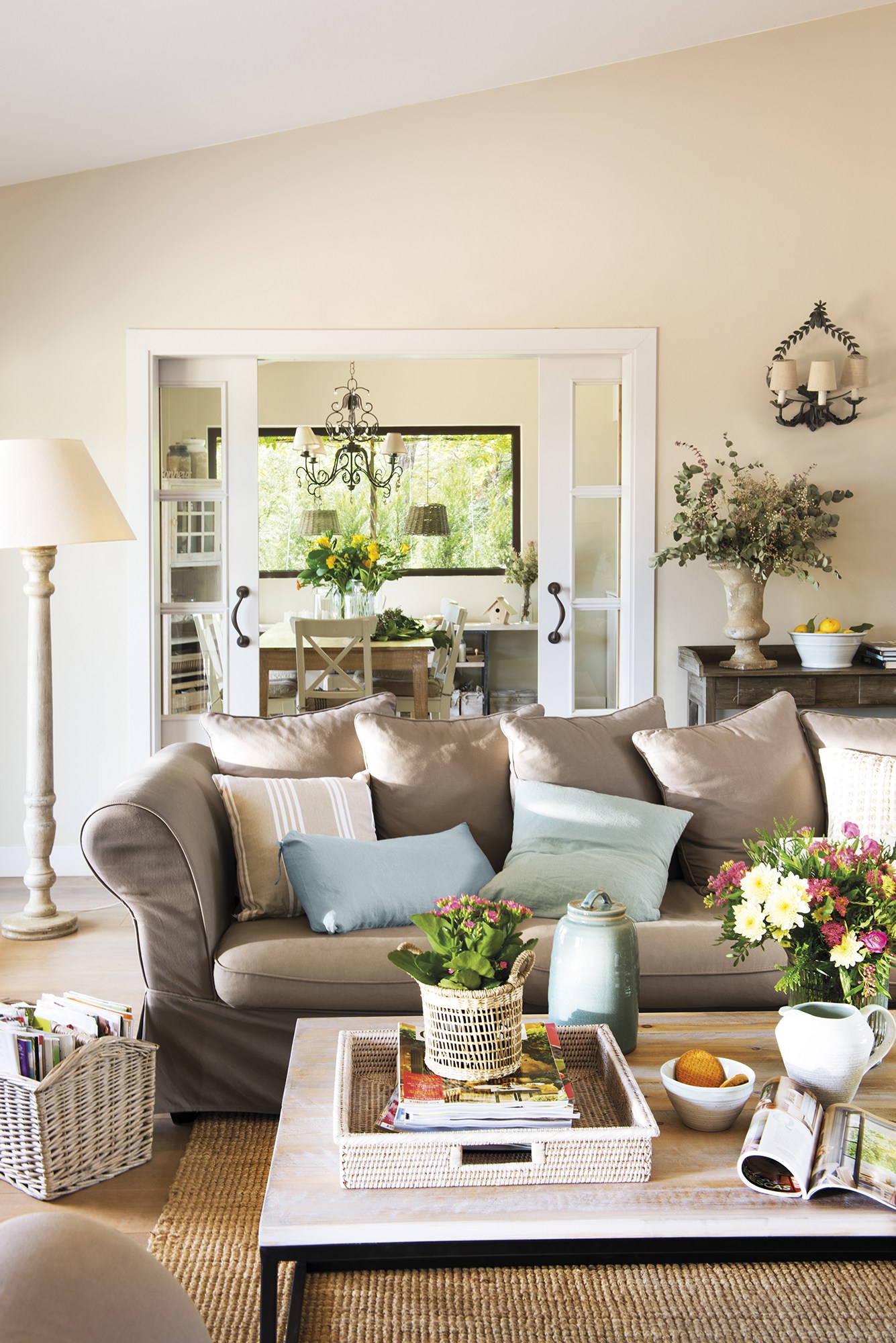 Комфортната мека мебел, рогозката на пода, старинните вази със свежи цветя и плетените подноси и кошове са само една част от стилистично подбраните акценти във всекидневната.