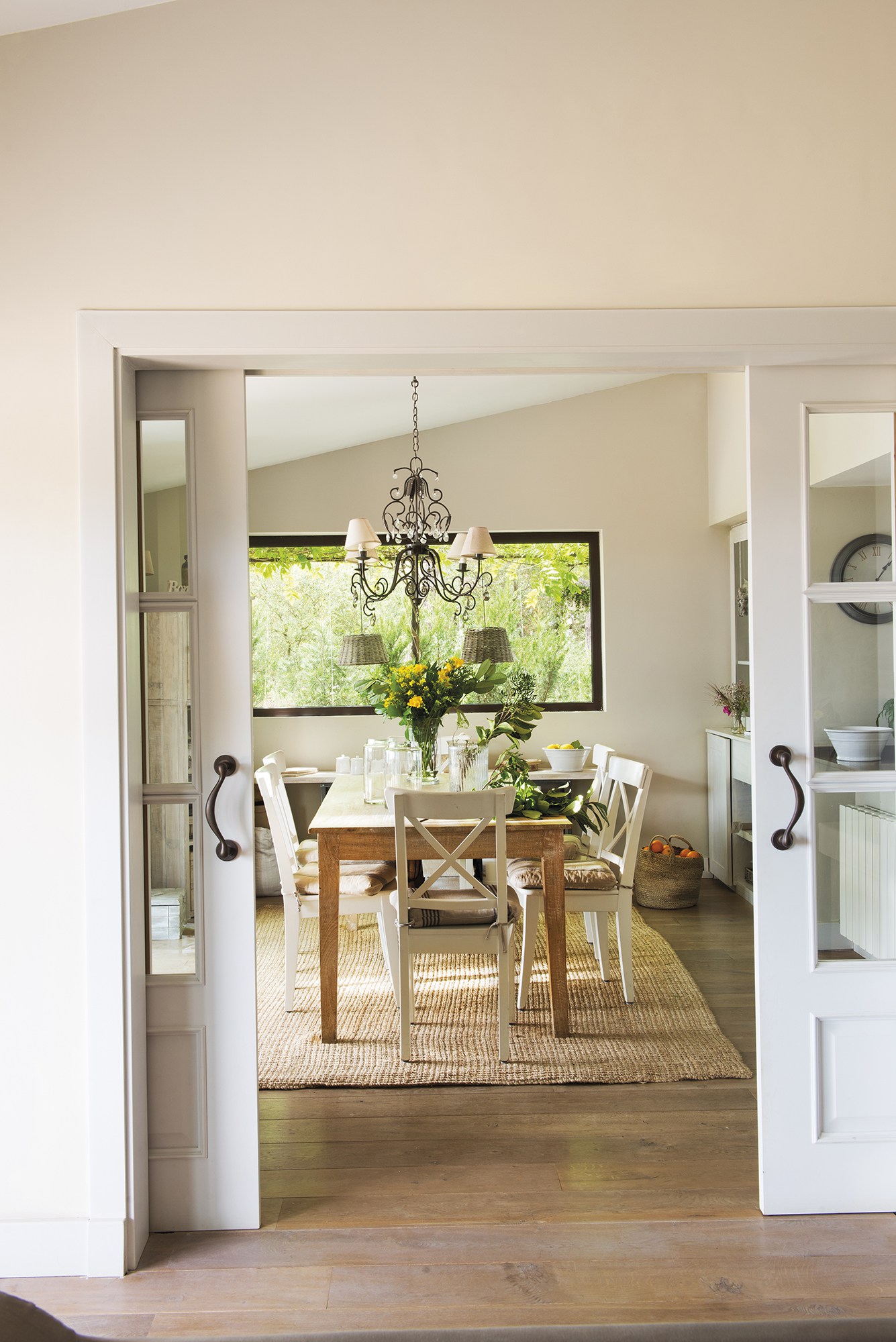 Бели плъзгащи се врати с красив обков разграничават площта на кухнята и трапезарията от тази на хола.