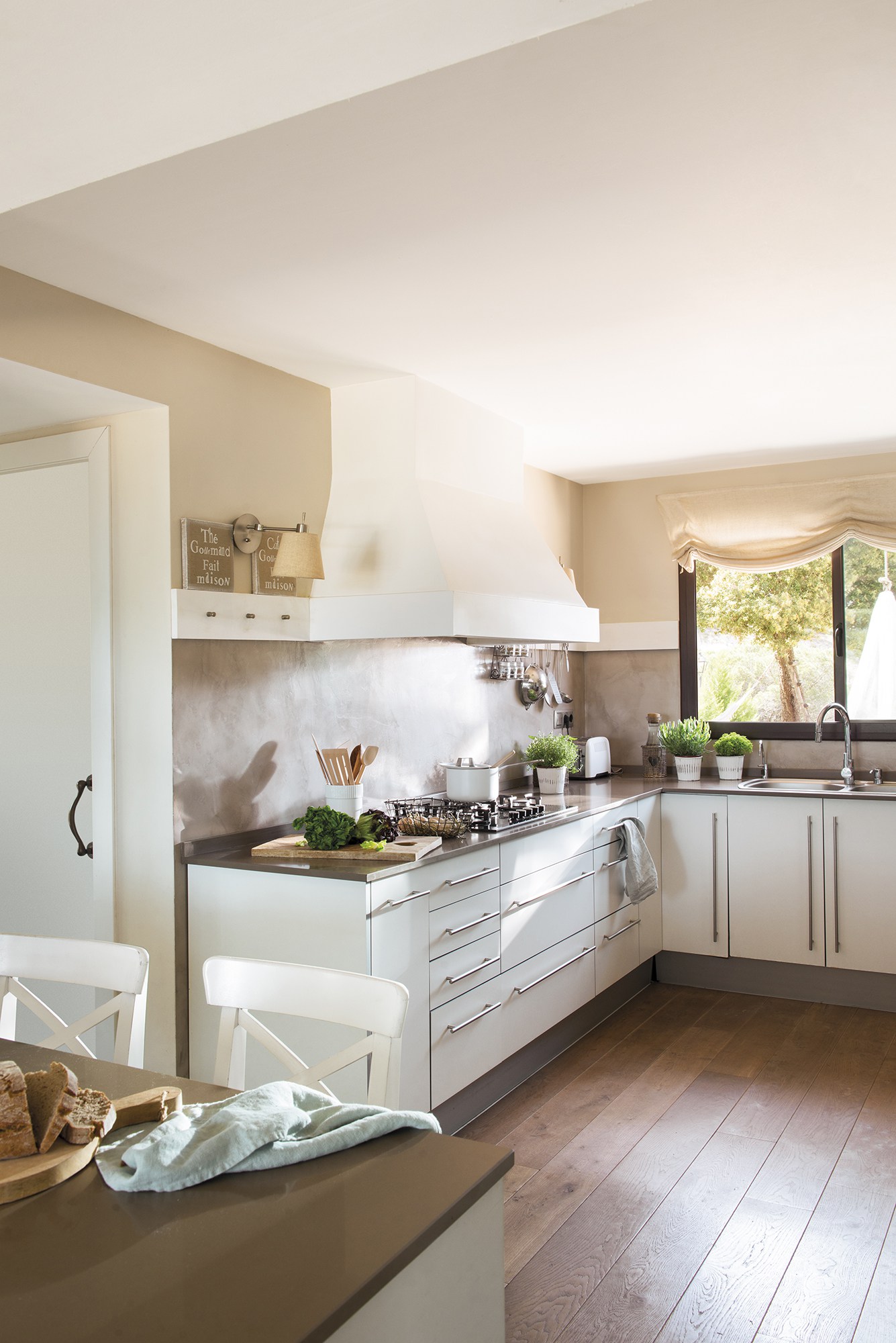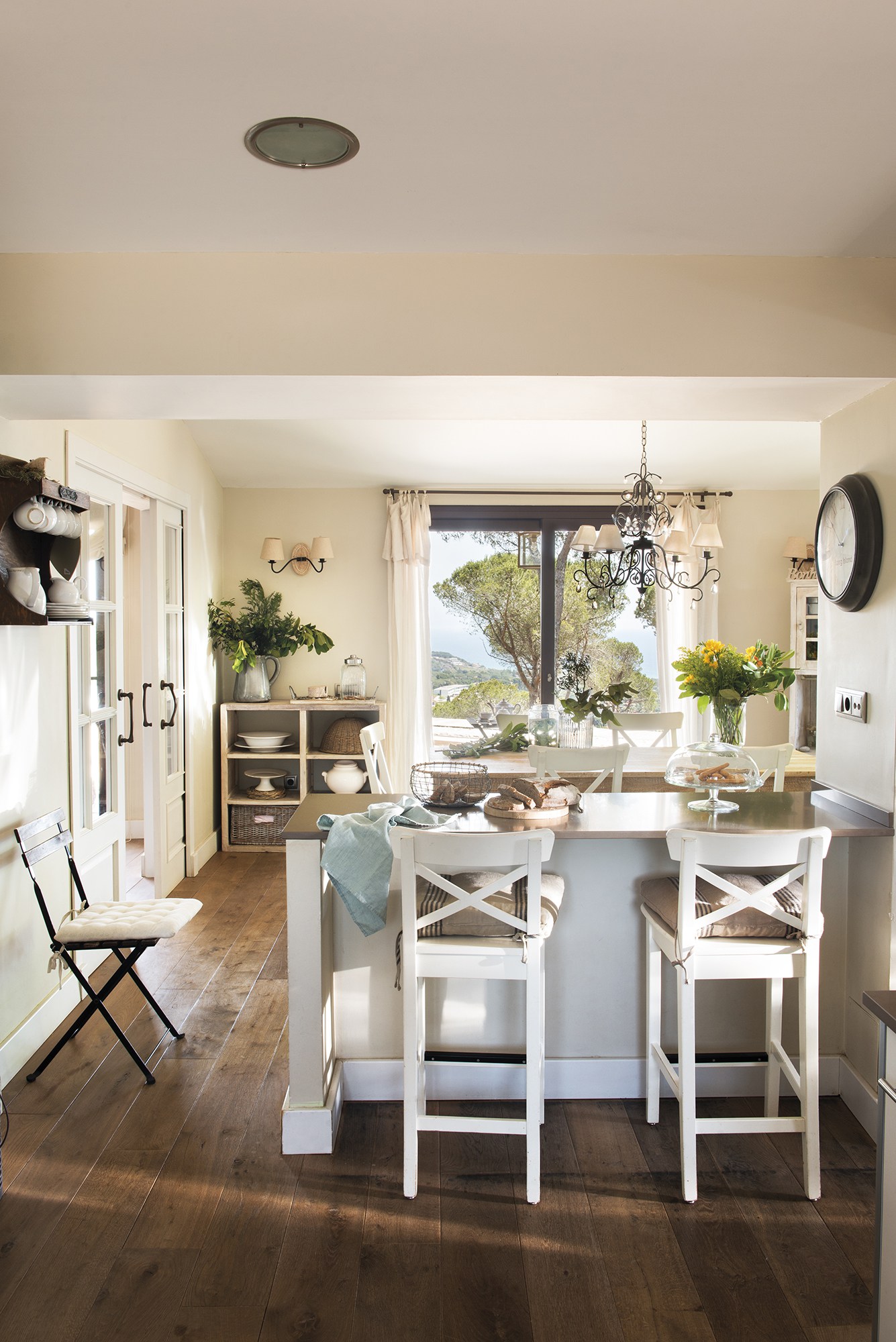 Дървеният под, състарените скринове, отворените лавици по стените, венецианските щори на прозореца и практичният барплот са предимствата в удобната и красива кухненска част на дома. Всеки детайл в трапезарията има своето въздействие и създава неподправена и уютна атмосфера.