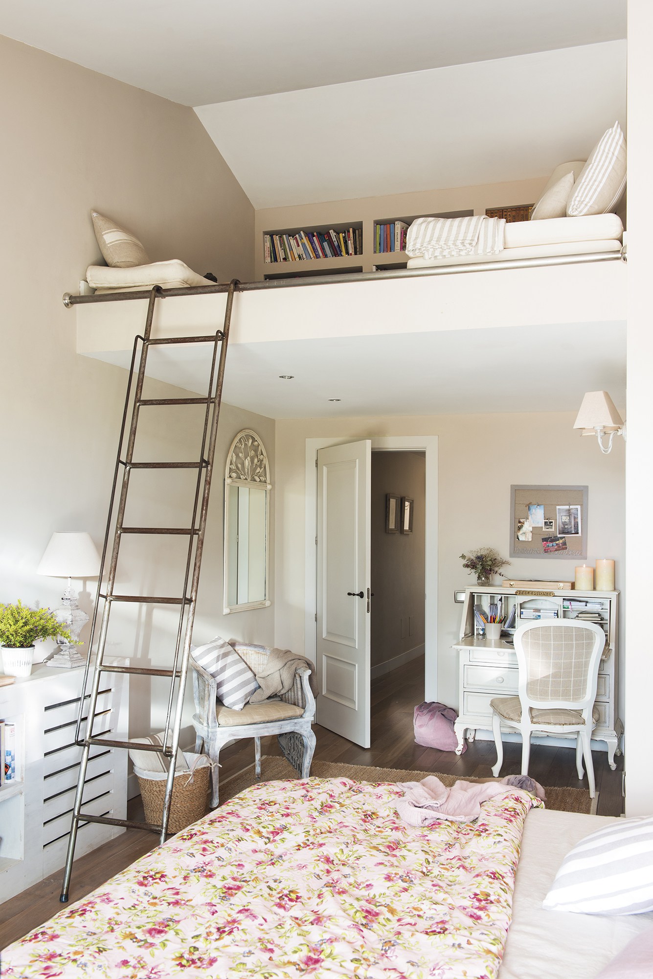 Спалнята е малка и кокетна. Обособена на две нива, тя изглежда перфектното място за усамотение и релакс. Легло, работен кът, гардероб и удобно кресло са част от приземното обзавеждане. Лека, метална стълба ни отвежда на второто ниво, където под скосения таван са позиционирани меки постели и удобни възглавници в близост до библиотеката на домакините. Големите френски прозорци с леки бели завеси позволяват навлизането на солидна доза естествена светлина в малката спалня.