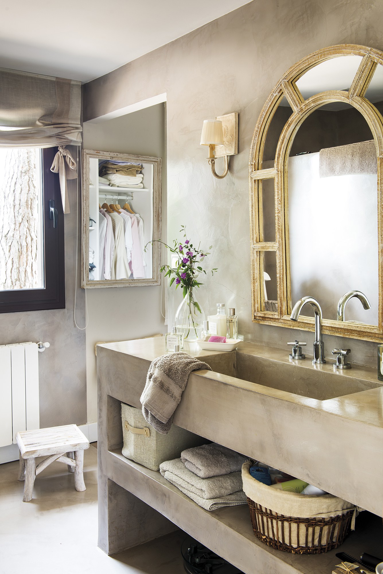 Стилната баня ни грабва с отличната си подредба на сравнително малко пространство. Бежови тонове, венециански щори, плетени кошници и голямо огледало с дървена рамка гарантират обаятелната визия на мокрото помещение.