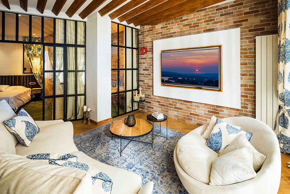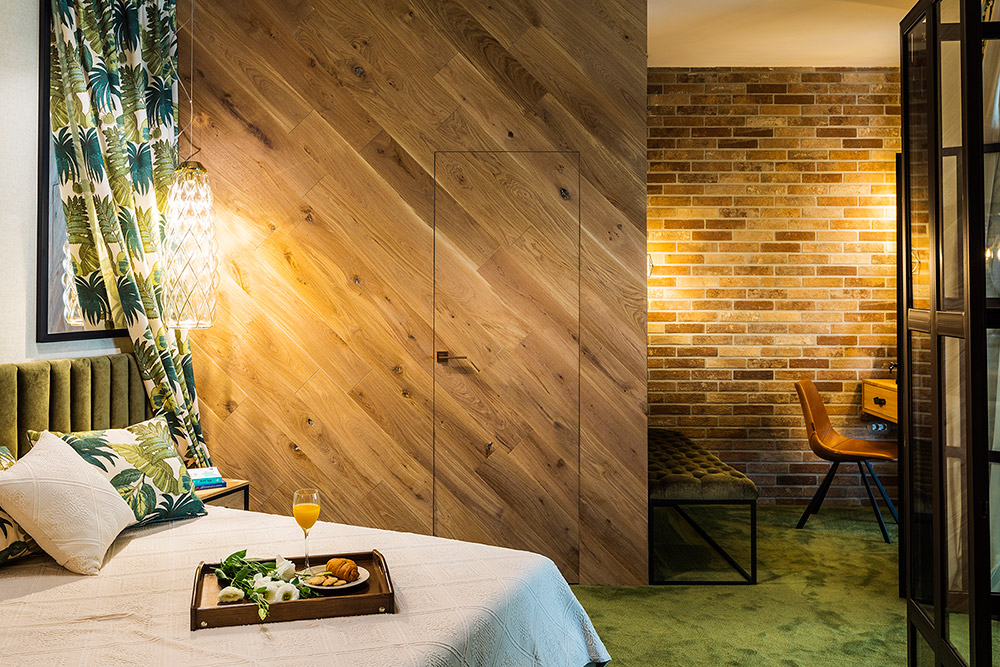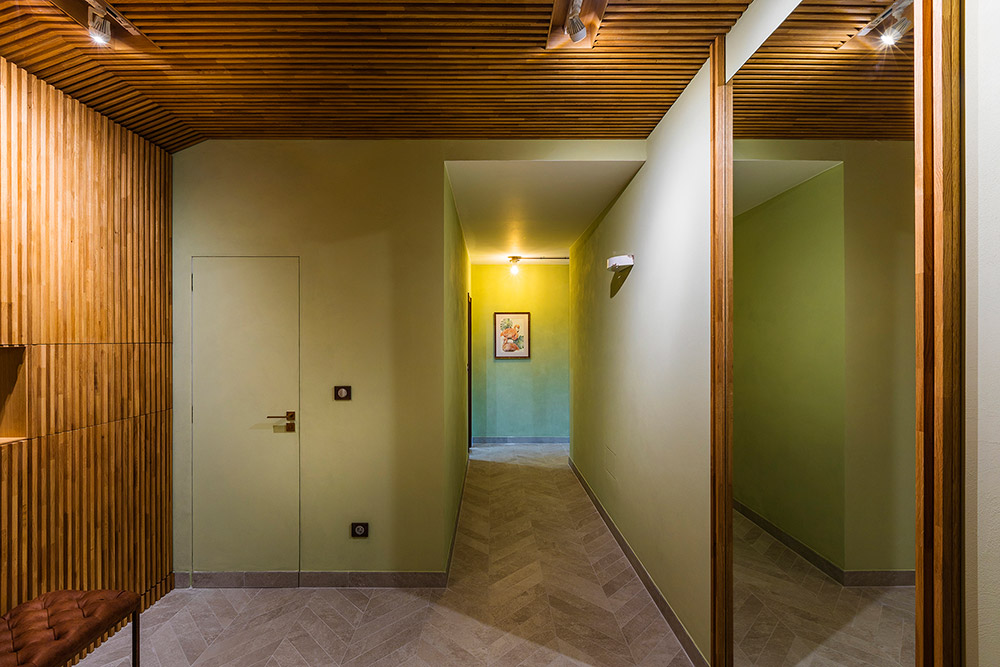 Собствениците имат пътешественически дух, обичат стара Европа и устойчивите материали за дома – в цветовата палитра на жилището са заложени дърво, керамика, кожа, лен, меки тонове с цветни акценти. Специален интериорен акцент е облицоването на вратите, за да имат визия на стари кожени пътнически куфари.