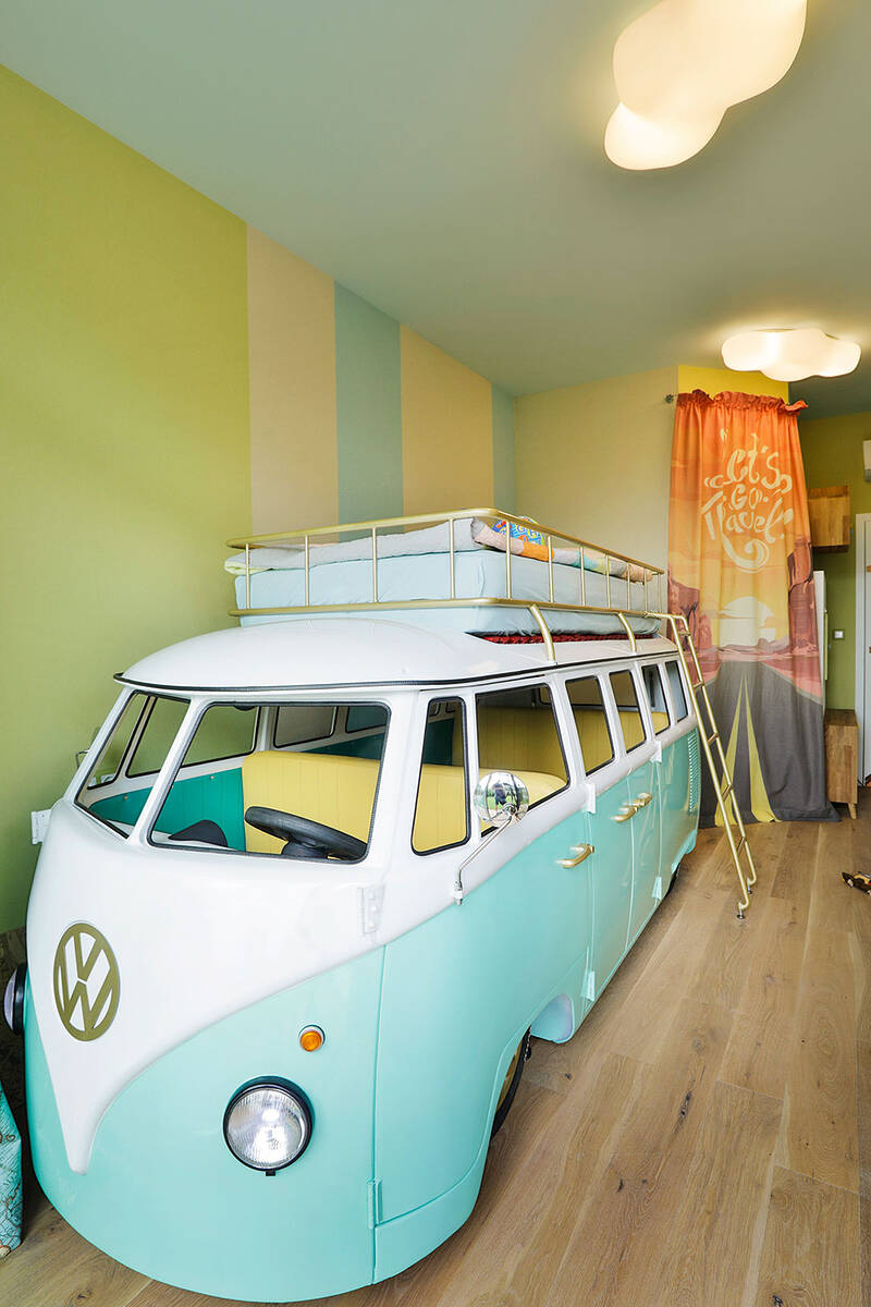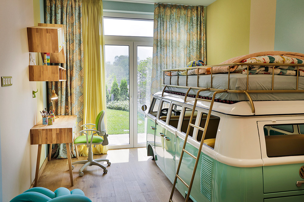 Сбъдната мечта на детето в дома (и на бащата) е леглото-микробус, умалено копие на известният миниван от 50-те години, който е пресъздаден до най-малкия детайл. Изцяло ръчно изработен, с истински джанти и гуми, волан и кожен салон, дори с работещо осветление!