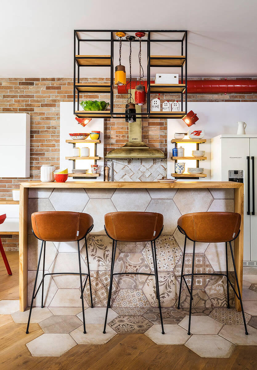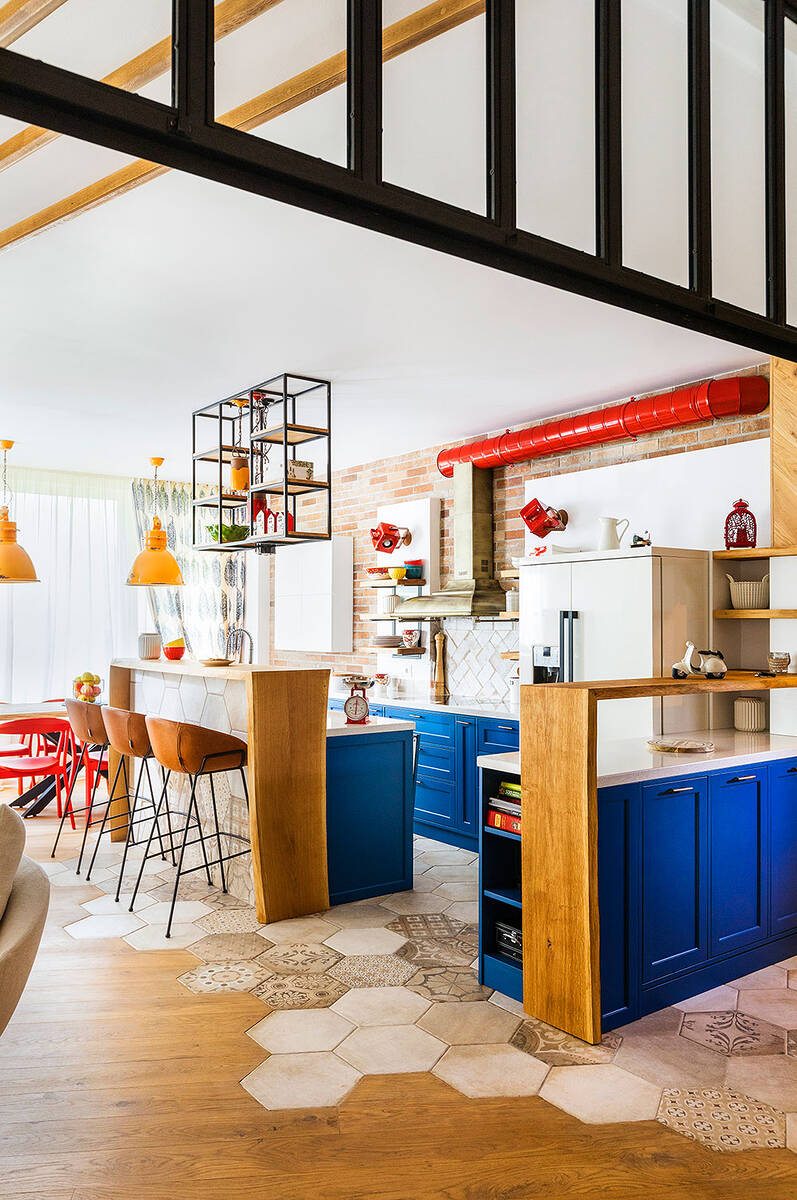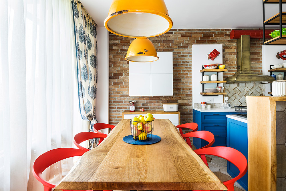 Понякога дизайна не може да бъде обяснен и да има категорична логика. Смело е, но както собствениците на това жилище, така и вие ще легитимирате, че се получи :) Всичко тръгна от синята кухня, избора на този силен цвят заяви, че тази зона ще има характер. В последствие жълтите осветителни тела дойдоха, като естествено продължение, а пък червеното се появи “случайно”- на принципа на отхвърляне на вариантите за столове за трапезарната маса. Тръбата на въздуховода е едно от онези “дизайнерски решения”, в които от дефект правим ефект. Трябваше на стигнем до комина, и видимата тръба беше част от по-индустриалното звучене, но избора на цвят беше едно от последните неща, които направихме. Някак естествено се получи…
