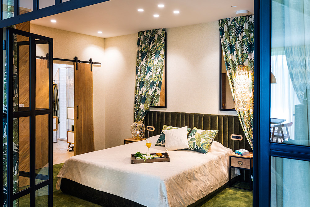 Родителската спалня с дрешник е изтеглена в северната част на апартамента, отделена с интериорни френски врати, за да може към юг да се обособи кухненското и дневното пространство, с панорамни прозорци и излаз към двора.