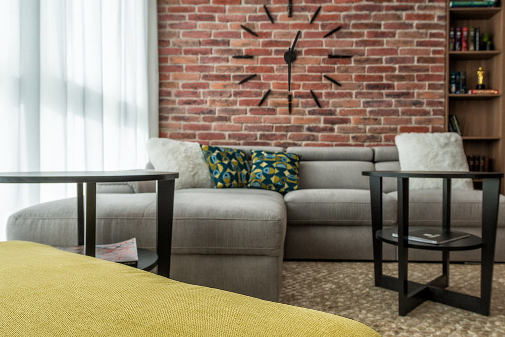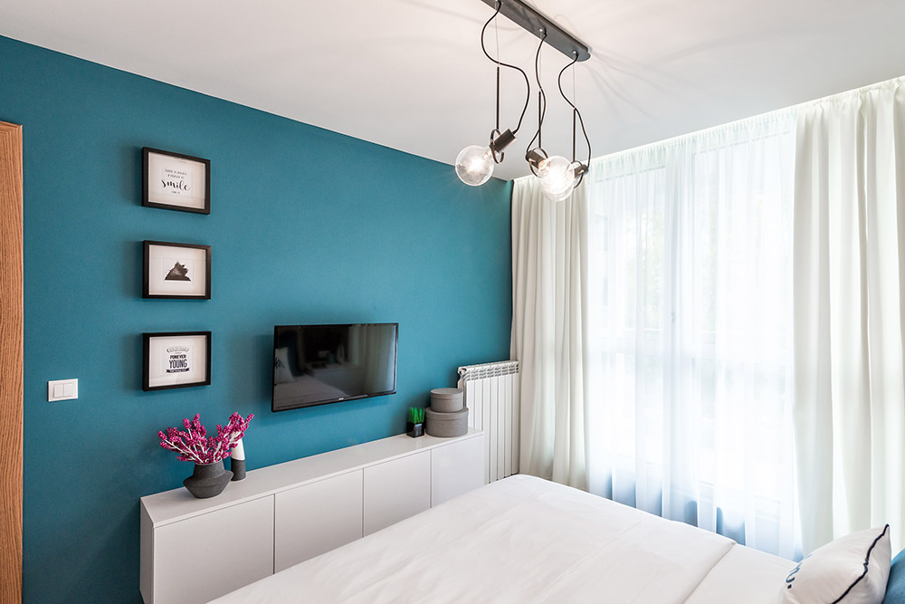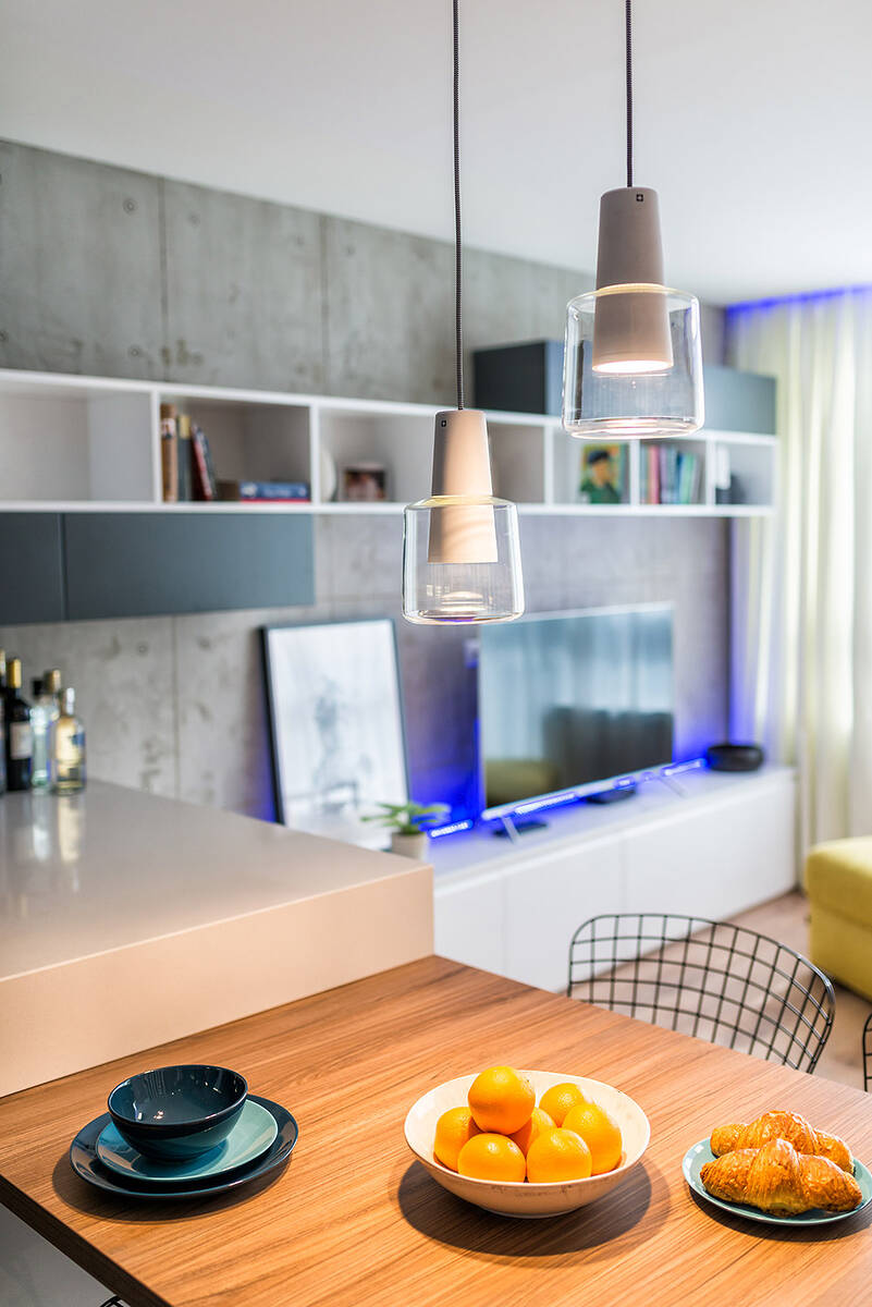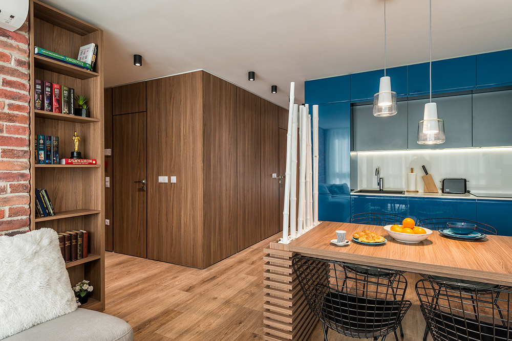Пренасяме се в един модерен апартамент, собственост на млад български режисьор, който живее и твори в дом, разположен на 90 кв.м. Интериорът, дело на Николета Кръстева от Extravagance Design, е наситен със сини акценти, а основните присъстващи материали са бетон, дърво и тухла. Обстановката е семпла и изчистена, но паралелно с това се забелязва една стилна динамика от топли и нежни цветове и функционални акценти.