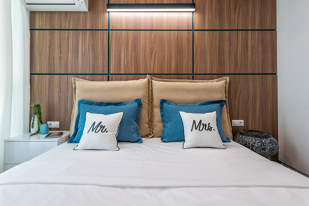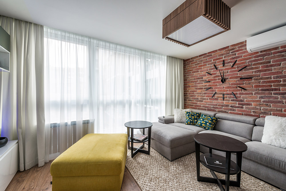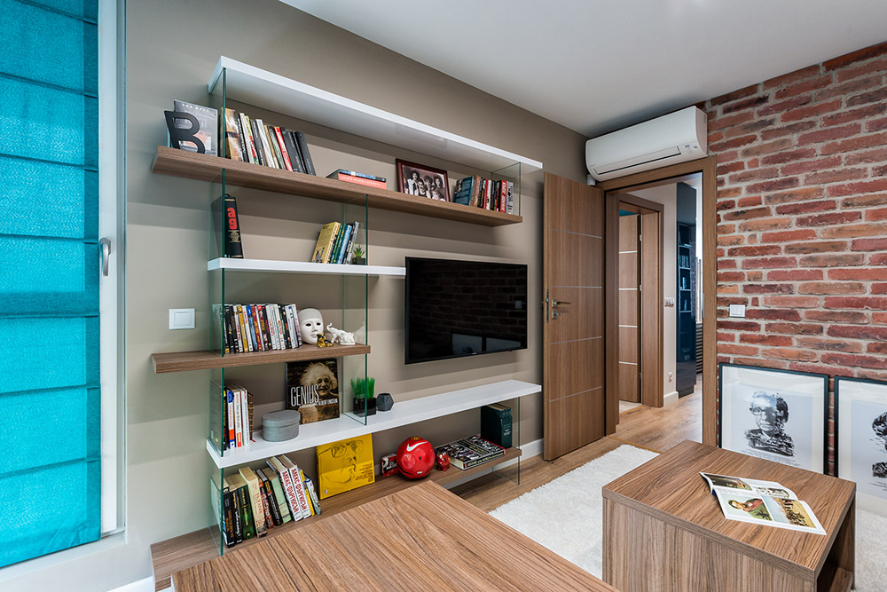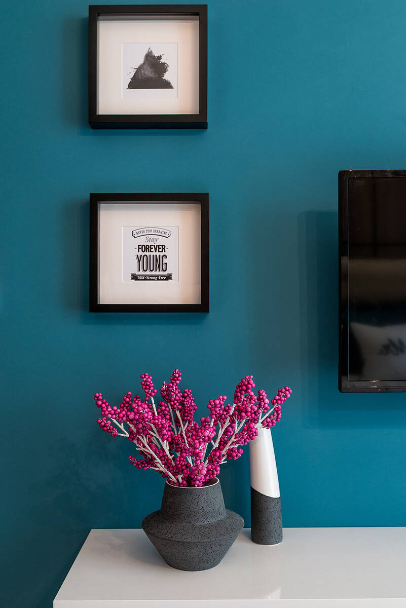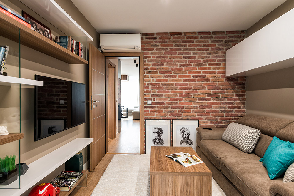 Пренасяме се в един модерен апартамент, собственост на млад български режисьор, който живее и твори в дом, разположен на 90 кв.м. Интериорът, дело на Николета Кръстева от Extravagance Design, е наситен със сини акценти, а основните присъстващи материали са бетон, дърво и тухла. Обстановката е семпла и изчистена, но паралелно с това се забелязва една стилна динамика от топли и нежни цветове и функционални акценти.
