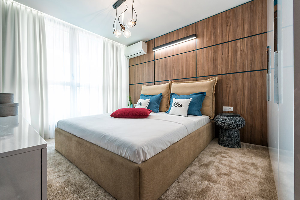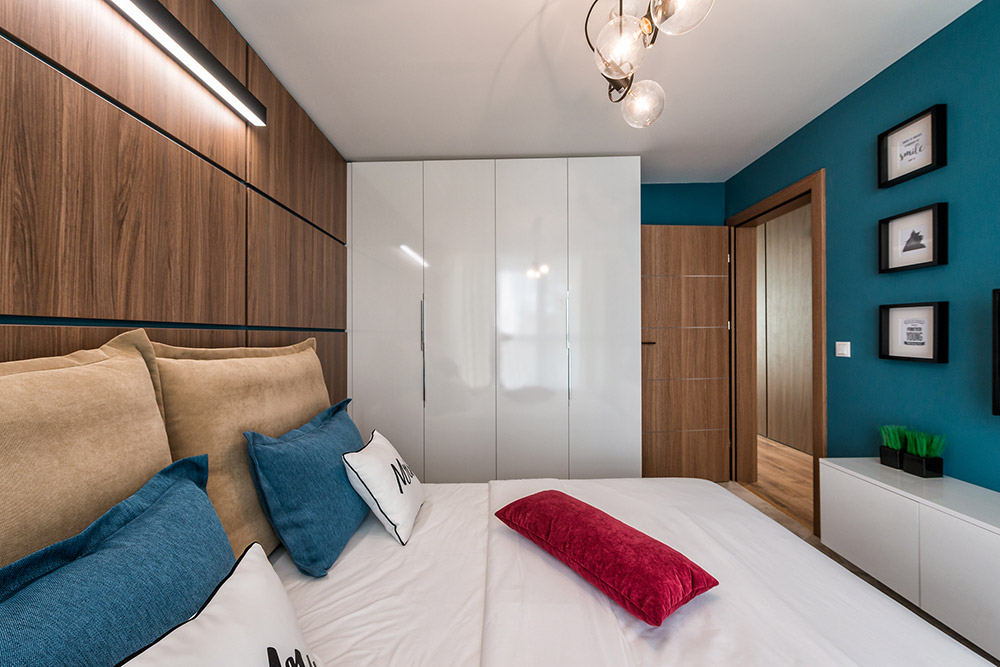 Спалнята е малка, но практично и ефектно обзаведена. И тук присъстват дървените ламперии, синият цвят, и интересното осветление. Гардеробът и скринът в бял гланц отразяват естествената светлина, навлизаща през френския прозорец.