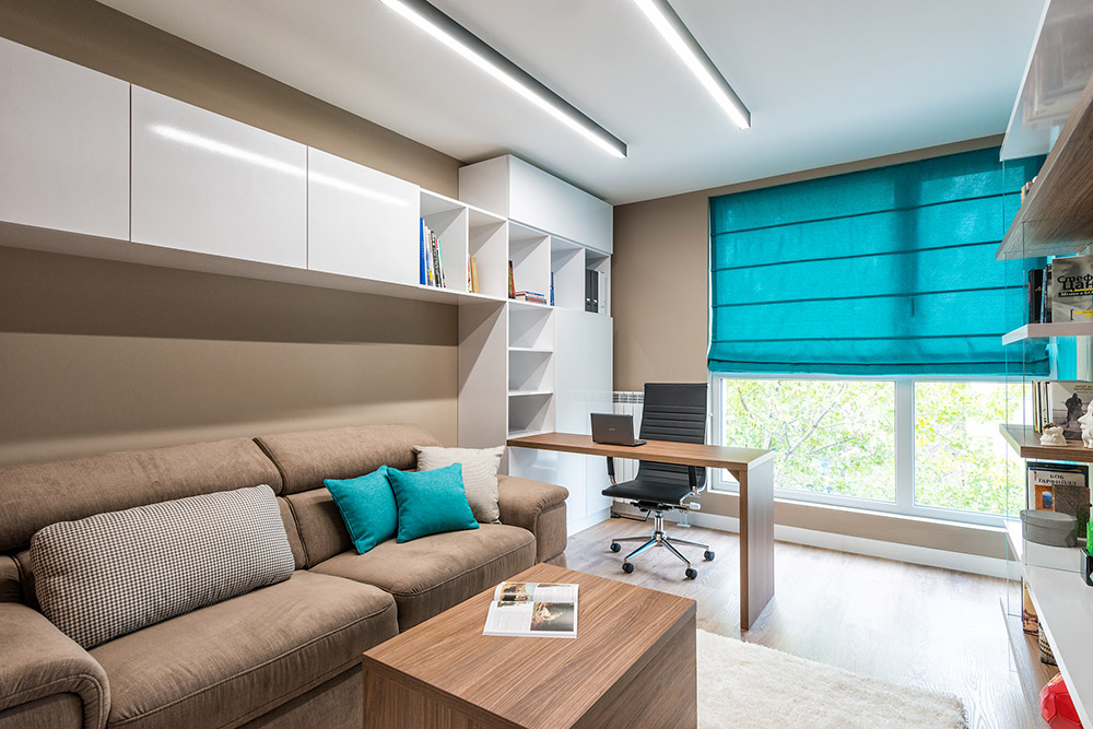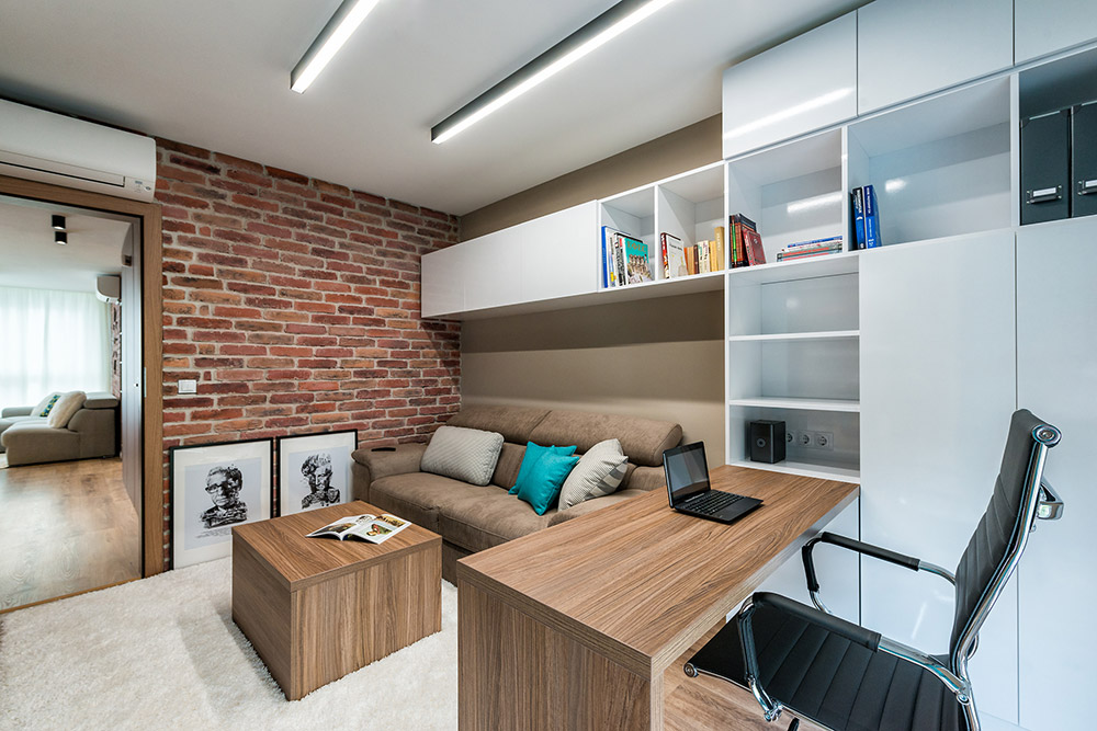 Кабинетът е важна част от този красив дом. Интериорът от дърво и тухла, в комбинация със сините акценти отлично кореспондира с меката мебел в кафяво и белите рафтове. Създава се чудесна атмосфера за творчество, която не отстъпва по нищо на всеки съвременен офис.
