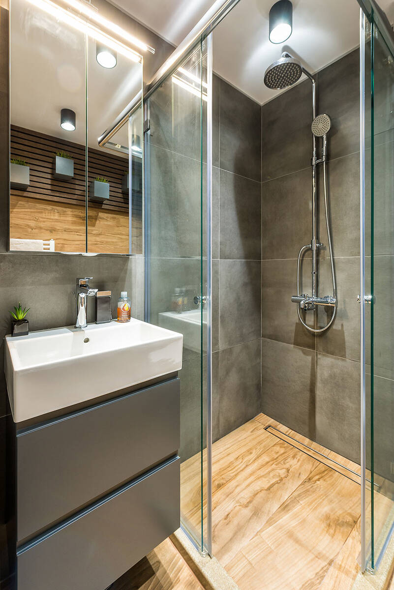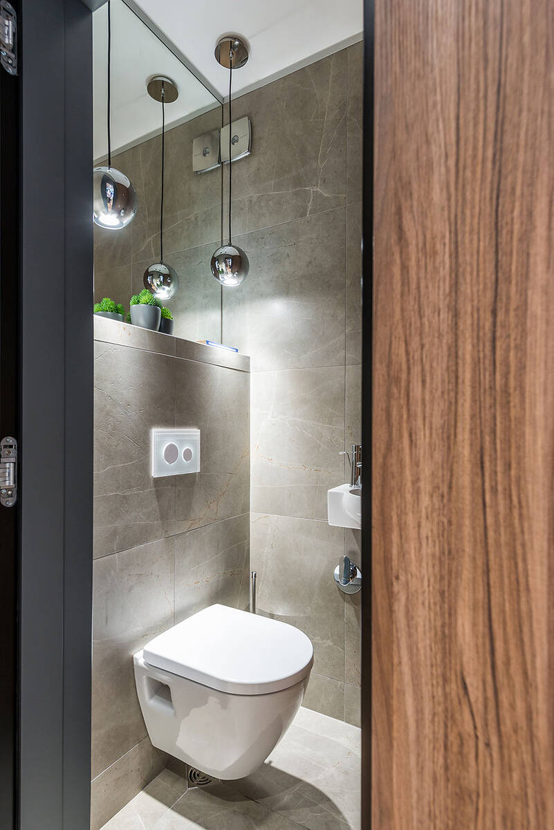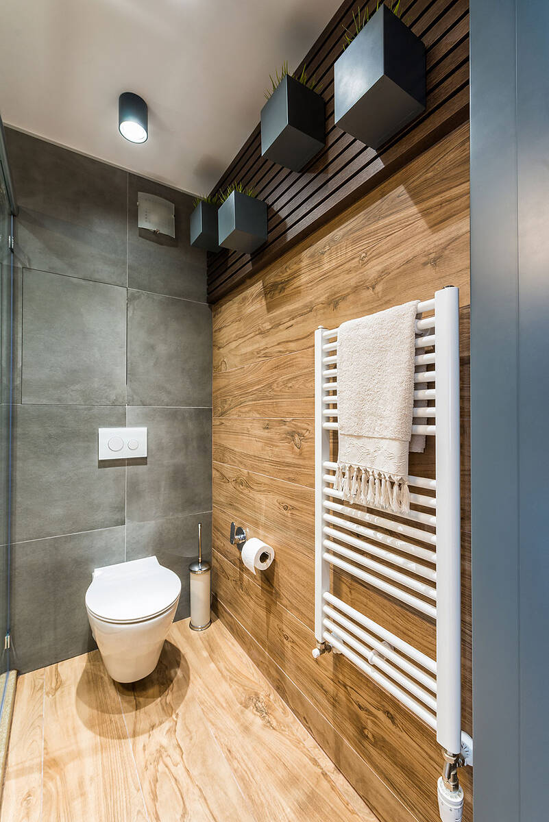 Банята очарова с компактна подредба и чудесна цветова комбинация между естествено дърво и бетон. Малките зелени акценти разчупват цветовата гама и внасят свежест в пространството.