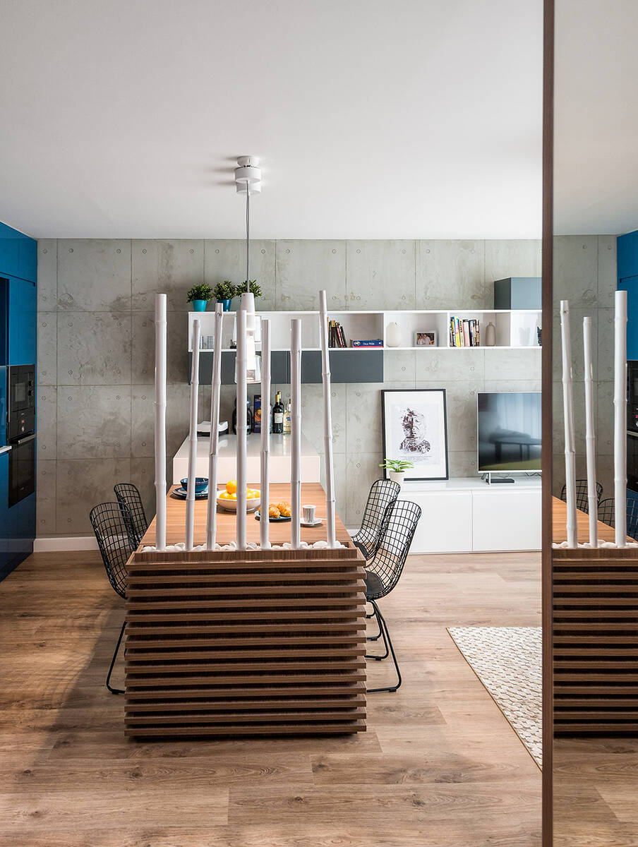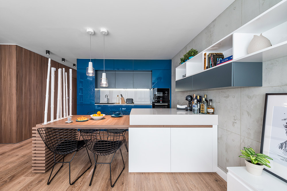 Всекидневната и кухнята са с отворена площ, което дава повече свобода и усещане за простор. Цвят на естествено дърво и бяло преливат във всяко от помещенията, а синият акцент в кухнята и в останалите стаи е търсен ефект от дизайнера. Инсталацията с бамбукови пръчки, като част от масата за хранене и красивите трапезни столове са уникална част от този модерен български интериор.