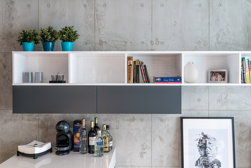 Вратите се сливат с ламперията, което допълнително отваря пространствата. Всяка лавица по стените има едновременно функционална и декоративна цел.