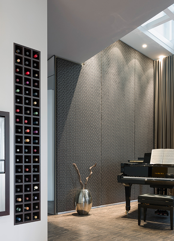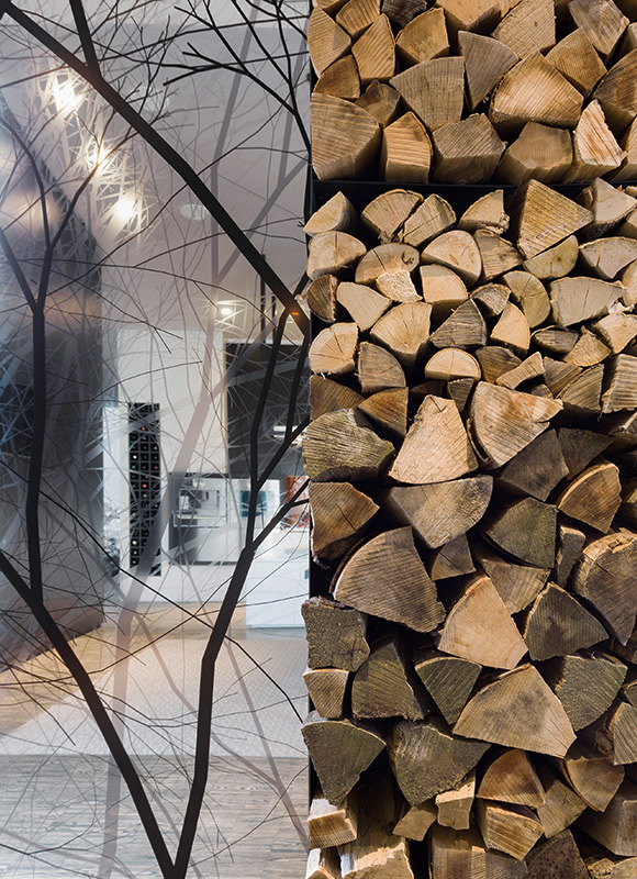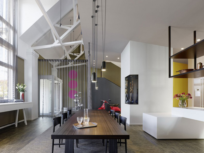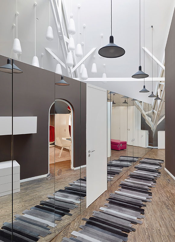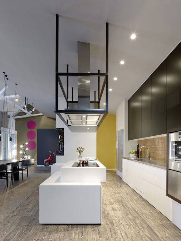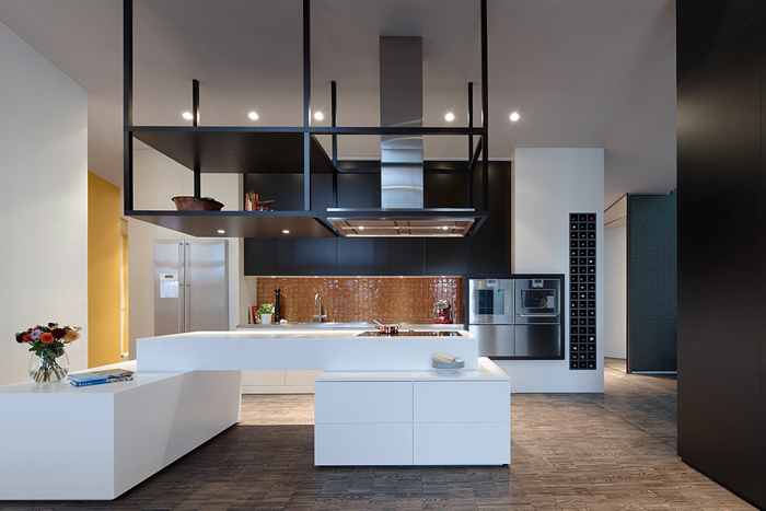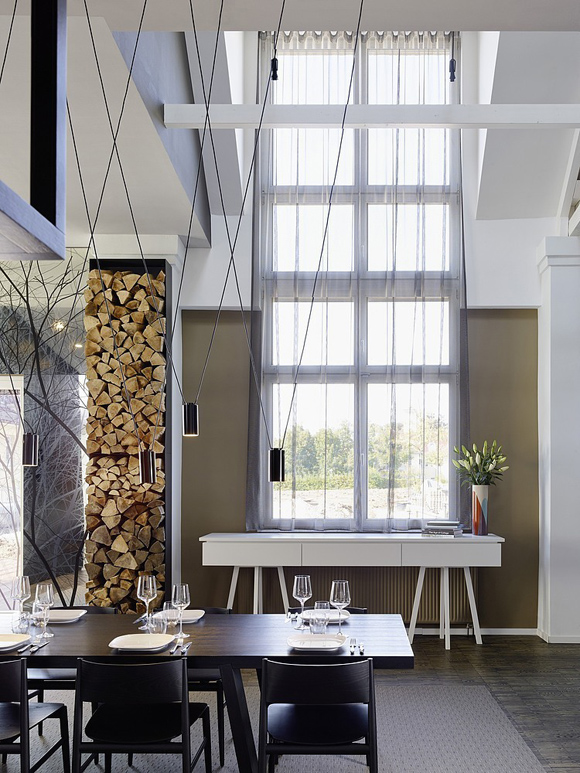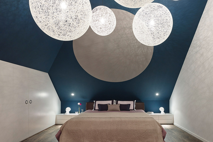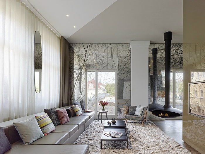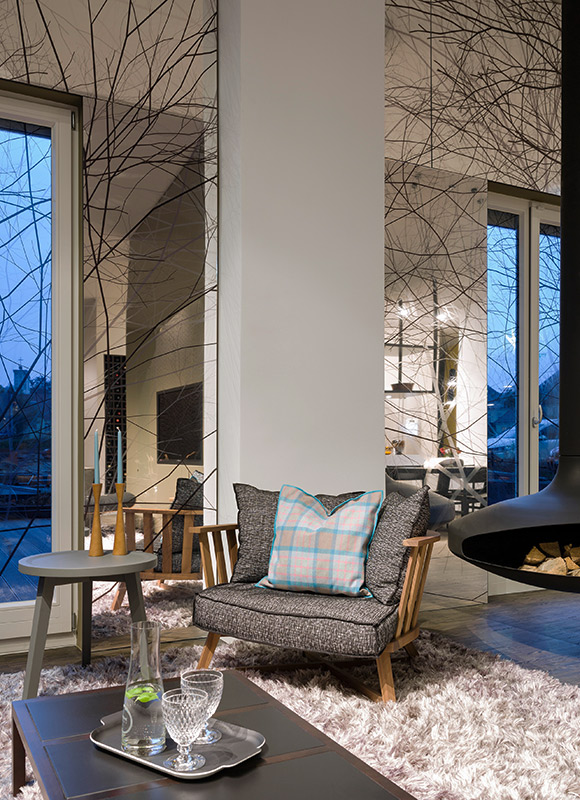 Друга ярка декорация в дизайна са осветителните тела. Стилни, красиви лампи висят от височина посредством преплетени кабели към пода. Оригинална черна камина с вид на мензура се спуска от тавана в хола. Разчупени форми на стените, нестандартно монтирано огледало сред завесите, метална конструкция над плота в кухнята и множество лунички за светлина из целия дом.