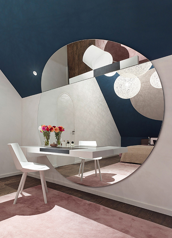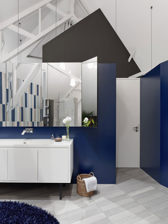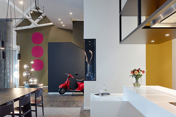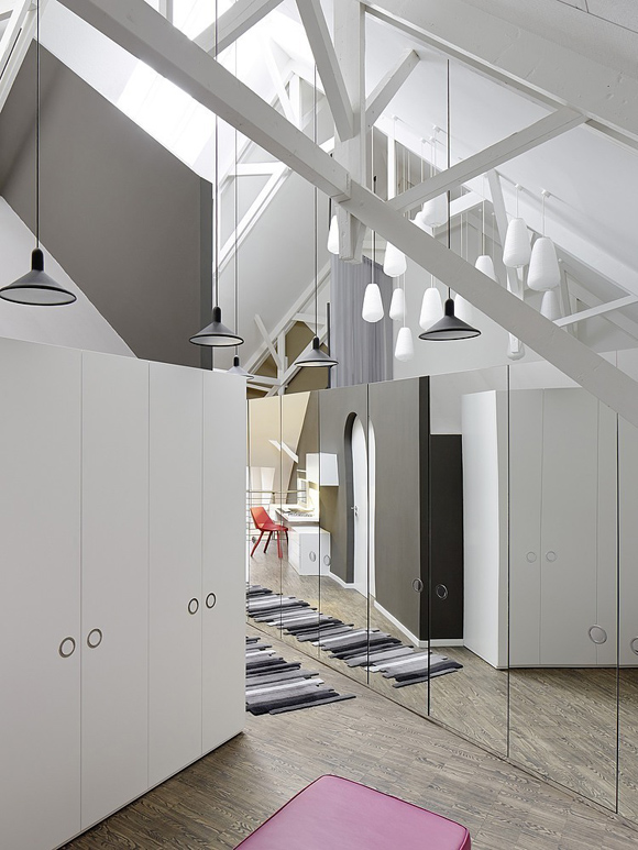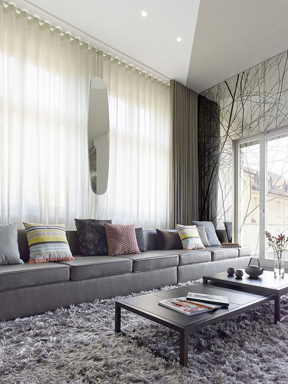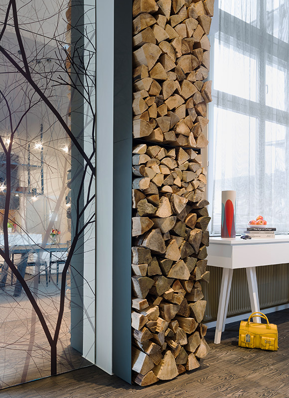 Отворено пространство, разумно разпределение на функционалните зони, смели дизайнерски решения – наистина стилно, модерно обзавеждане на дом за семейство с две деца. Интересно впечатление правят формите и цветовете в апартамента. Стените са боядисани в различни пастелни и ярки нюанси с акцент върху определени форми – кръг в трапец, неправилен петоъгълник, или просто квадрат в квадрата.