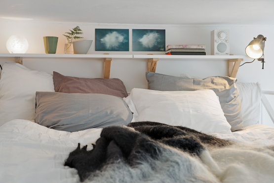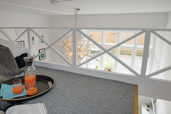 Семпла стълба в ъгъла на хола ни извежда до таванската конструкция, преобразена в спалня. Удобен нисък матрак, красив предпазен парапет, нежен мокет, нощни лапми и семпла декорация. Отлично вписано в цялостното обзавеждане в бяло.