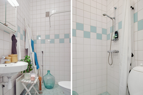 Банята, досущ като всичко останало, е тонирана предимно в бяло, а леки сини акценти във фаянса разчупват обстановката.