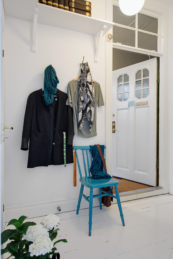 Антрето е огледало на визията в целия дом. Изглежда нежно, опростено и ефектно. Дървен стол в тюркоазено синьо, замества портмантото и освежава пространството под закачалките на стената.