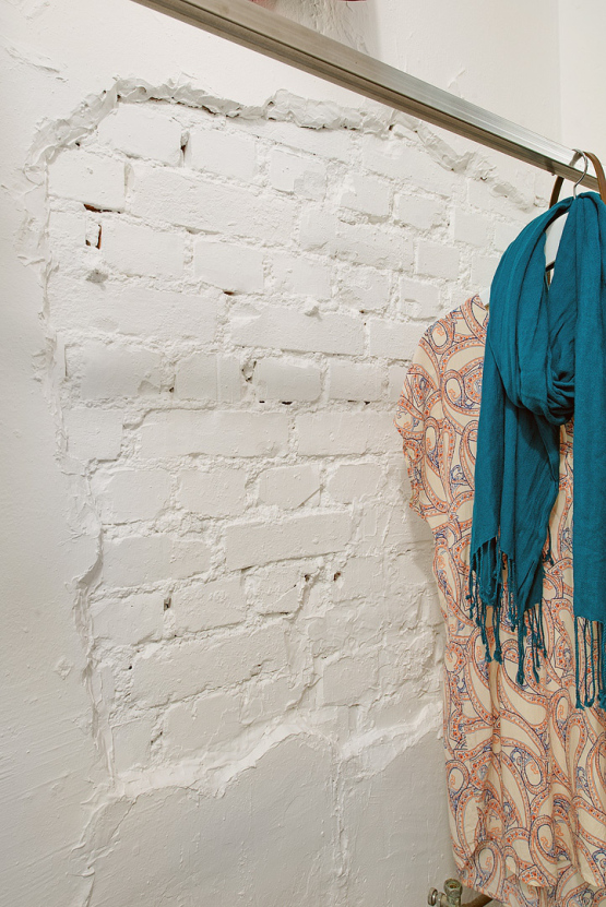 Надниквайки в килера откриваме тухлена стена с индустриална визия, голямо огледало за отваряне на площта, кош за дрехи и алуминиеви летви на стената, позволяващи съхранението на дрехи по закачалките.