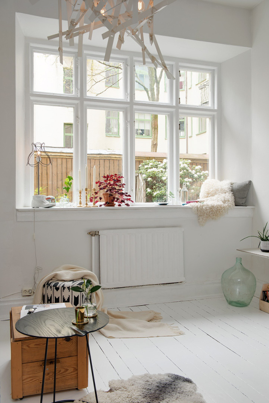 Очарованието на този апартамент идва на първо място от гениалното разпределение на пространството и обзавеждането. Високият таван на апартамента е позволил да се импровизира максимално и да се усвоят всички ниши от помещението.
