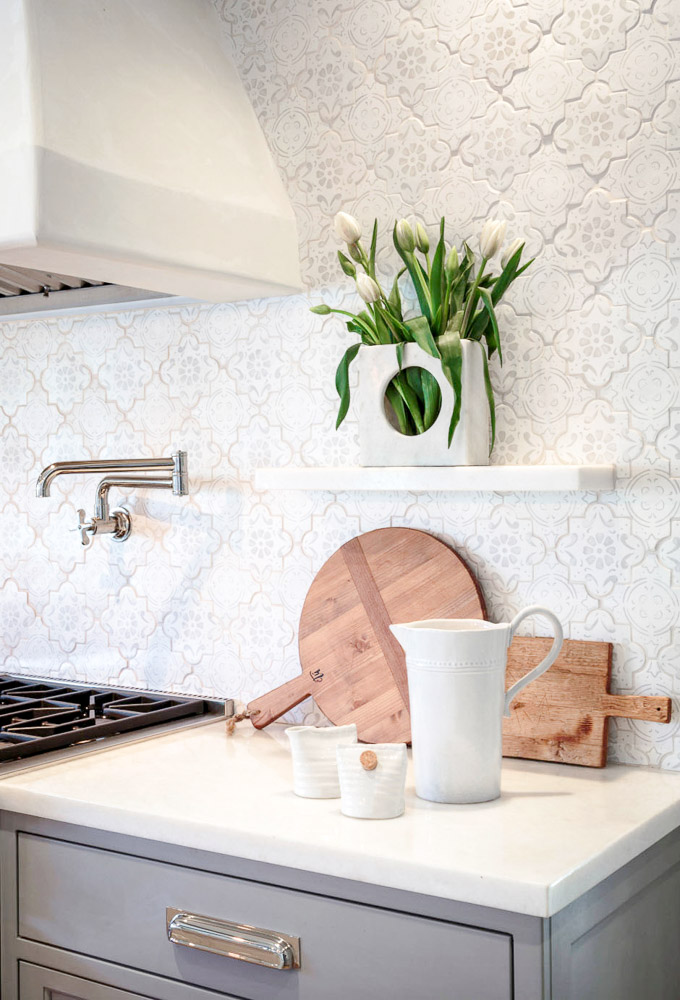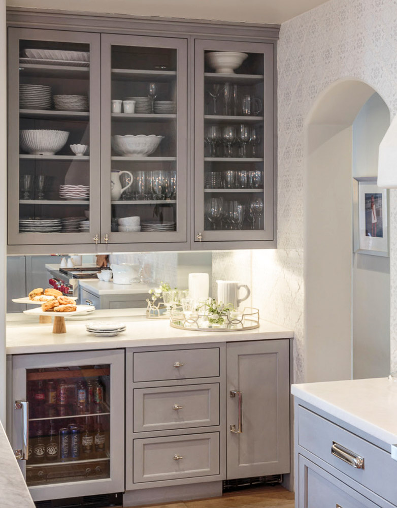 Кухненската част е решена в бяло и сиво, с голям кухненски остров с мраморен плот, шкафове до тавана и гръб от светли плочки в арабски стил. За допълнителна дълбочина са добавени горни шкафове със стъклени врати, под които огледален гръб отразява светлината. Мястото за хранене е представено от ъглова мека мебел с масивна маса от състарено дърво, разположена до прозорци с уникална гледка към планината и градината.