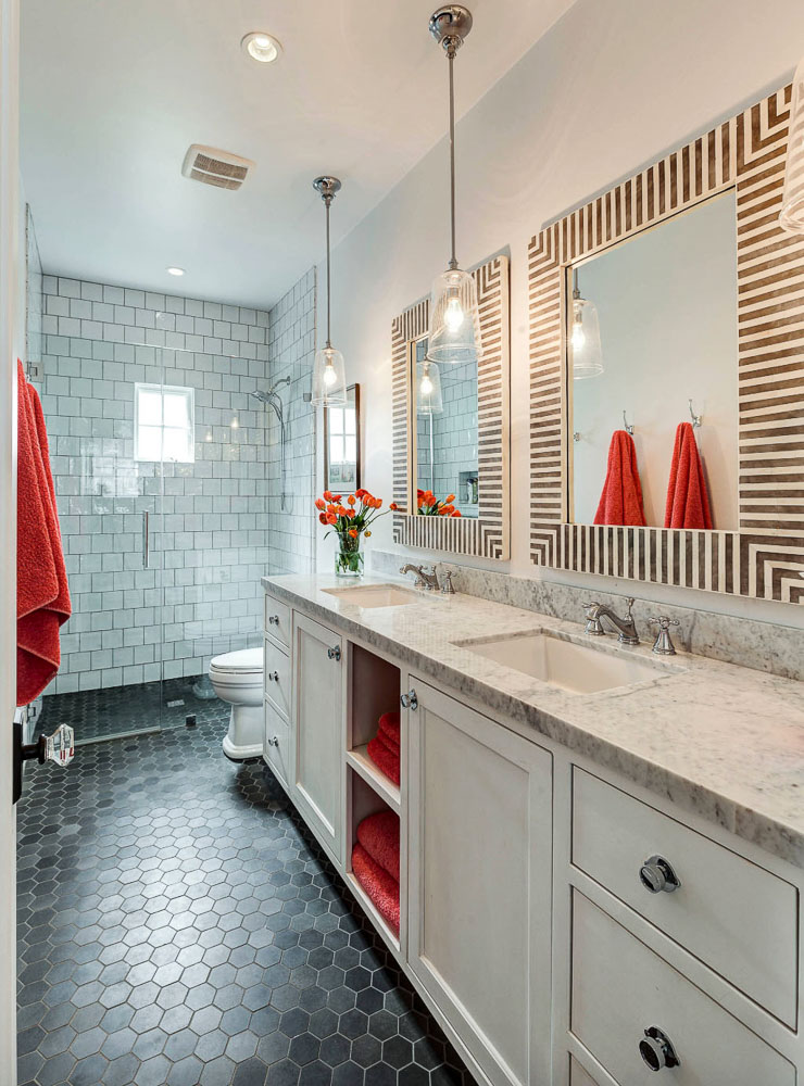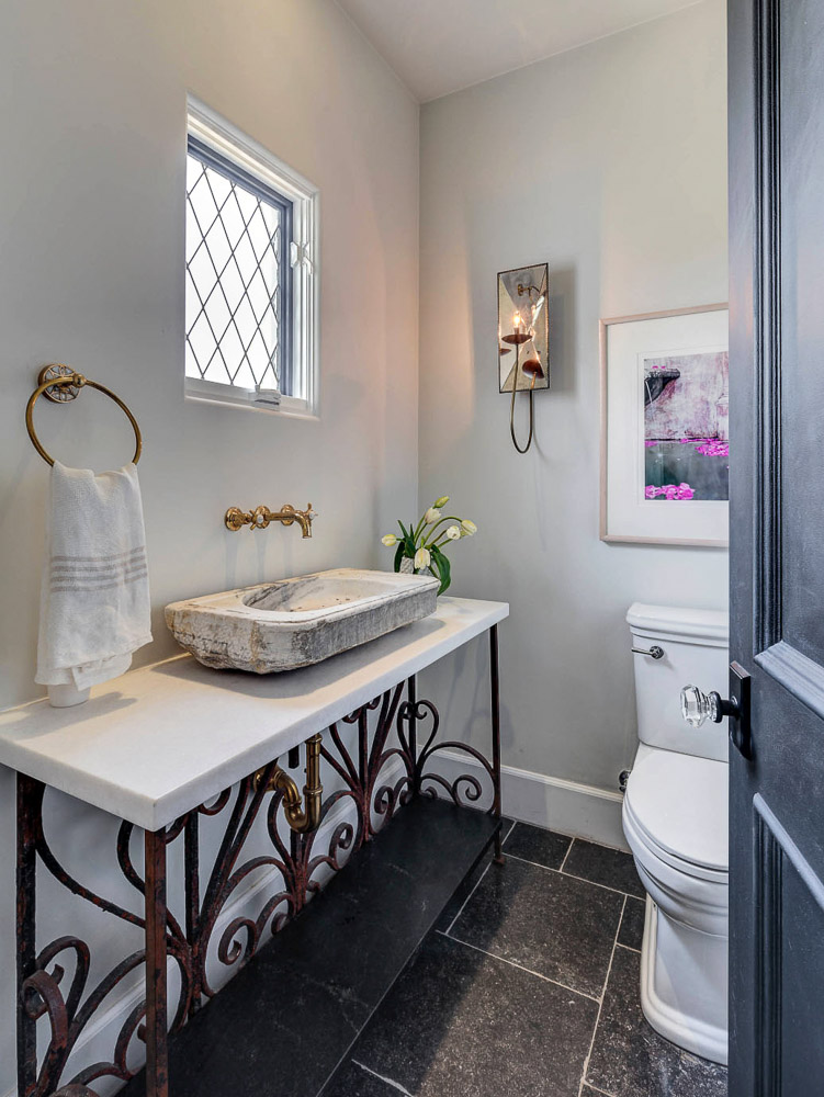 Мокрите помещения са решени в бяло и сиво. Рустик стилът се усеща в металните детайли в златисто и ковано желязо, които допълват необикновена каменна мивка в едната баня. Другата баня е изградена със сиви плочки тип пчелна пита, душ кабината е облицована с малки бели квадрати, а дизайнът е допълнен от огледала с интересни рамки.