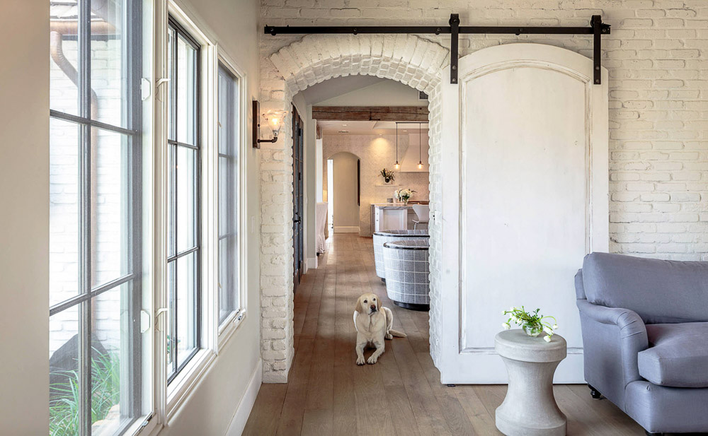 Останалите помещения са отделени с тухлена стена в бяло, типична за провансалския стил, а плъзгаща се врата с арка допълва усещането за непринудена обстановка.