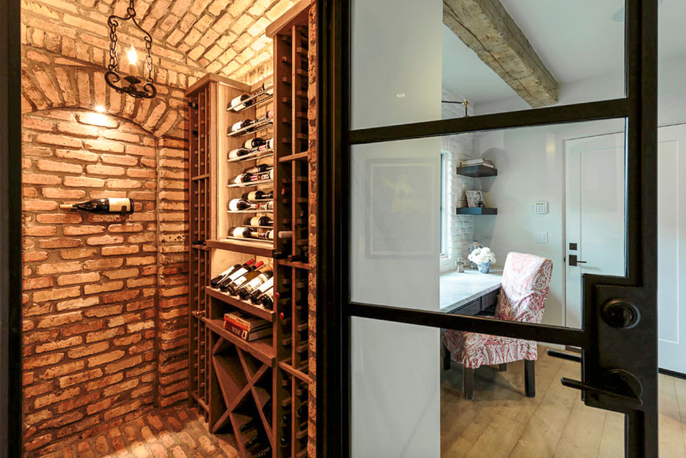 Работният кът в една от стаите продължава цялостната концепция от мрамор, тухла и шкафове в сиво, допълнени с метални елементи. В близост до него се намира малка винарна в типичен френски стил – състарени тухли по всички стени и подове, полилей от ковано желязо, и дървени етажерки, приютяващи бутилки с една от най-древните напитки.