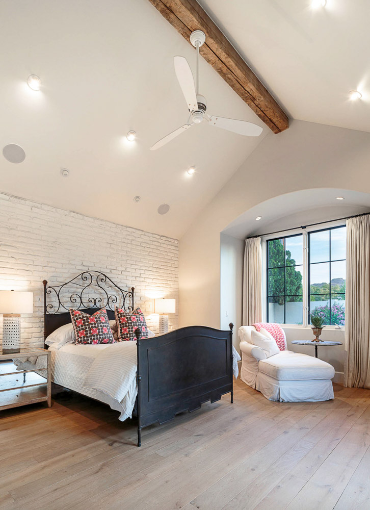 Основната спалня е изпълнена с простор. Малки осветителни тела озаряват черно метално легло с орнаменти, разположено до тухлената стена, която е красив акцент, срещащ се в целия дом, а бяла лежанка осигурява удобство в близост до прозореца.