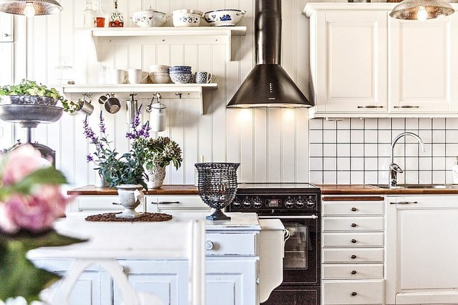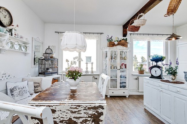 Когато чуем за стил шаби шик, в представите ни изплуват износени ленени и памучни тъкани, бледи пастелни цветове, елементи с декопаж, ръчно рисувани плоскости и други подобни красиви изкушения. Този дом предлага всичко това. Белоснежна чистота, богата орнаментика с ефектни мотиви се наблюдава на територията на цялото жилище. Наред със стила, прозира и скандинавското усещане за дом.