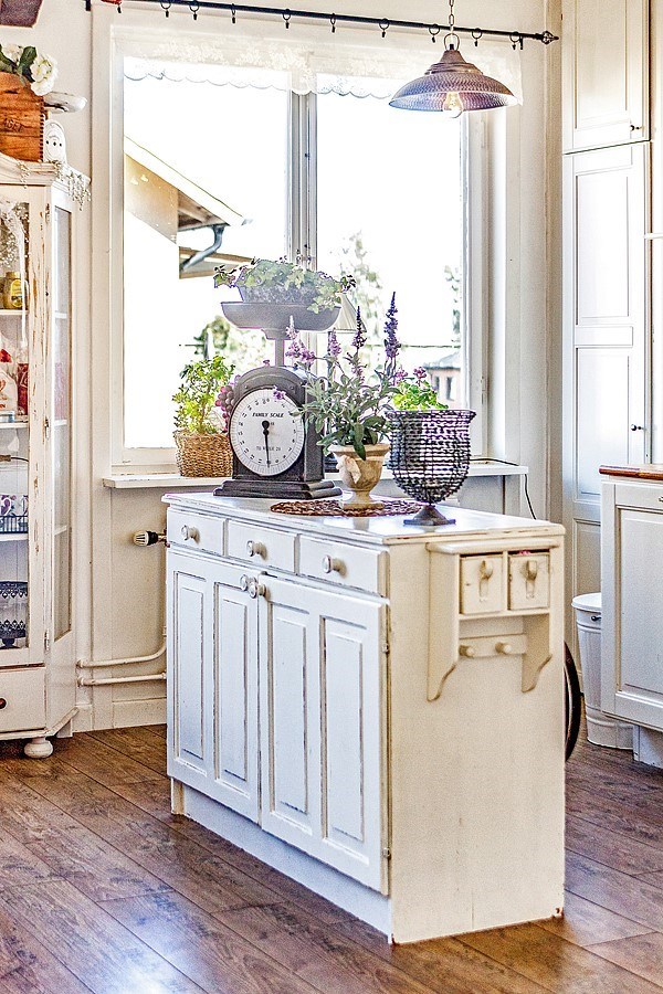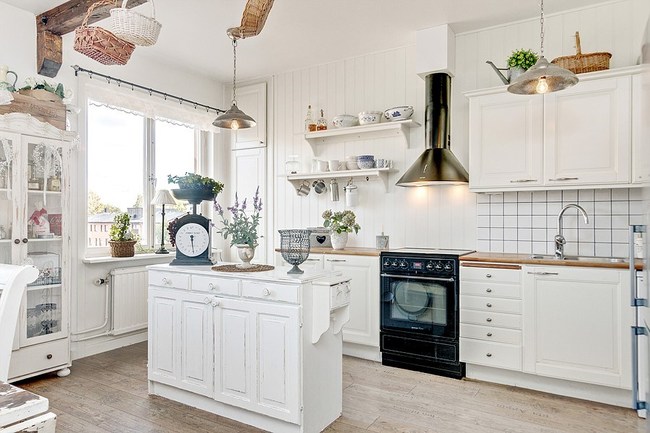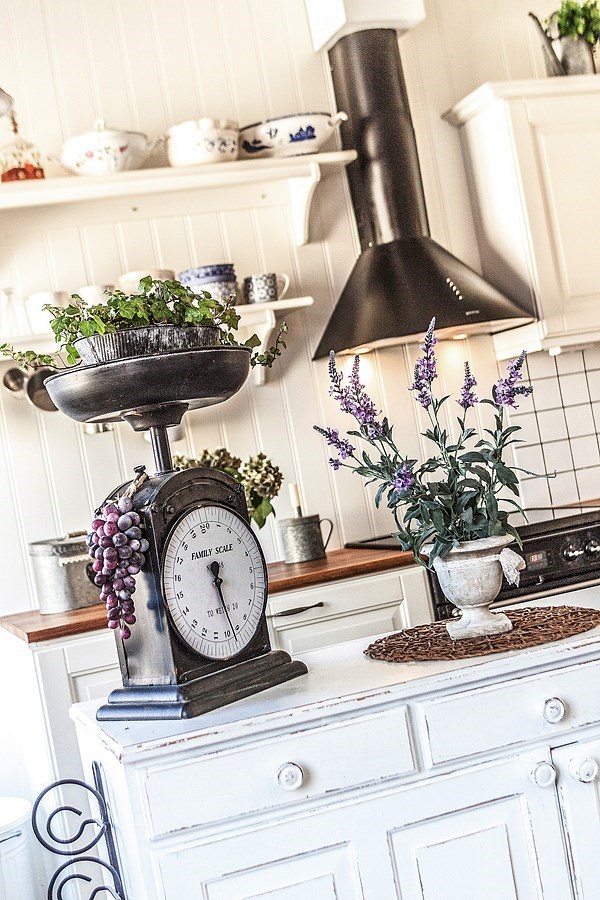 Едва ли ще успеем да споменем всичко, което допълва елегантната визия в дома, но ще подчертаем основните акценти, които са причина за изявения шаби шик дизайн. Сред тях са красив метален кафез за птици, уникални полилеи, изобилие от старинни часовници по стените и скриновете, плетени кошници, ретро кухненска везна, състарени рамки по стените, богата фина орнаментика по мебелите и зеленина. Всичко това е съчетано отлично в този красив и романтичен шаби шик апартамент.