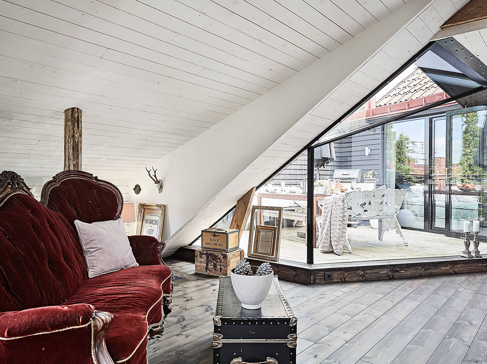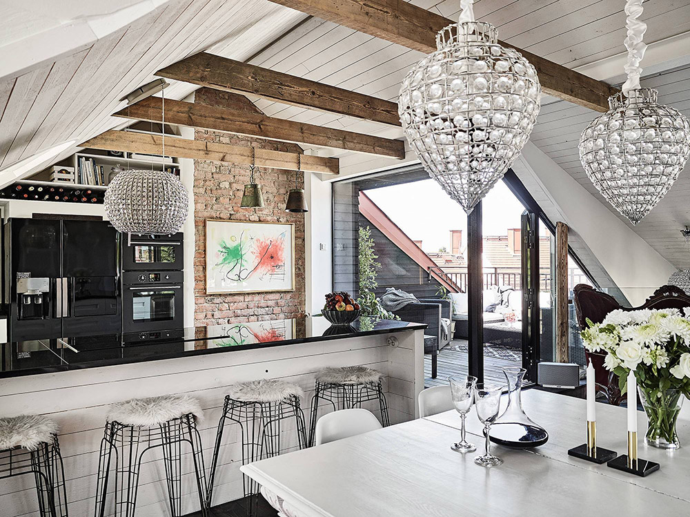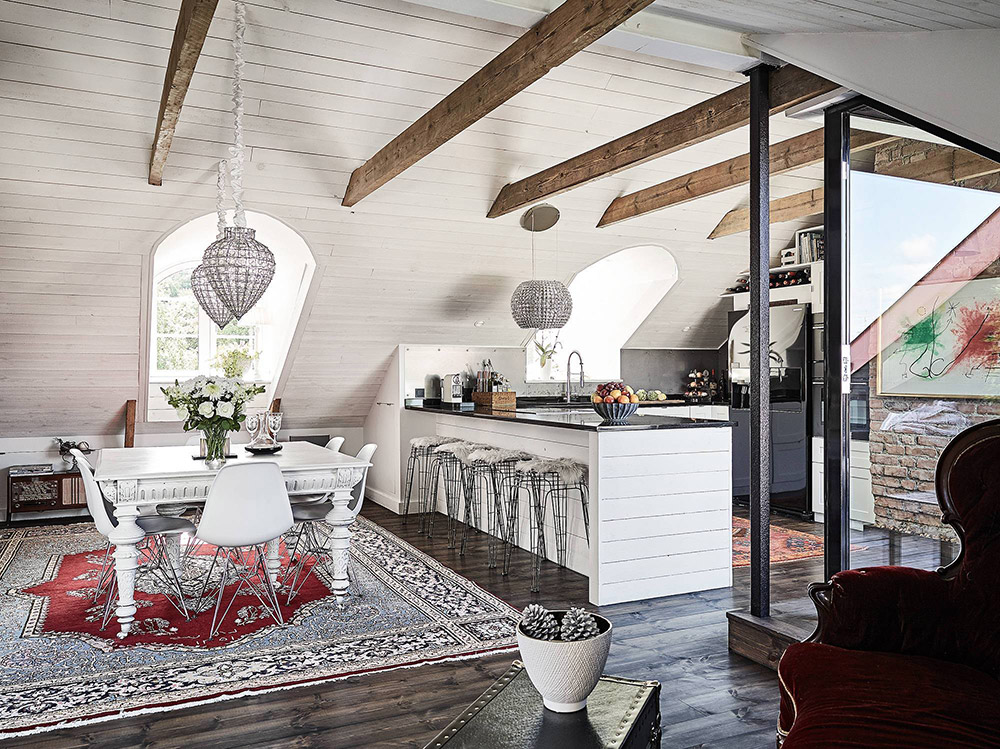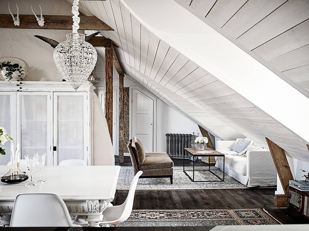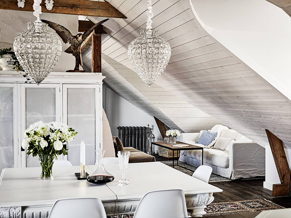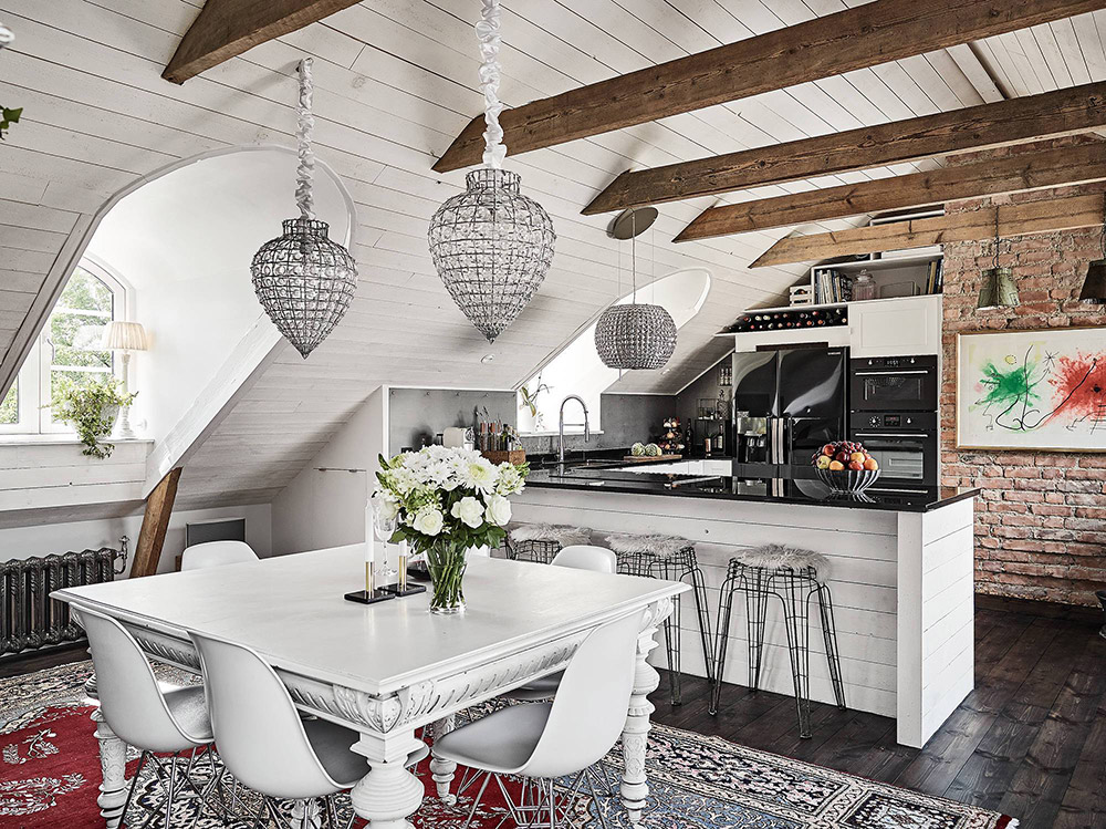 Напълно логично белият цвят е избран за основен на територията на този апартамент със скосен покрив. Бели тавани, стени и дървени ламперии се простират във всяка част на жилището. В унисон с тези конструкции на места се прокрадват тухлени и циментови акценти, както и масивни дървени греди. На този фон изключително интересно са вписани кристални полилеи, плюшени дамаски, декорации със златисто покритие и кресла с богата орнаментика. Внушителен и атрактивен винтидж декор.