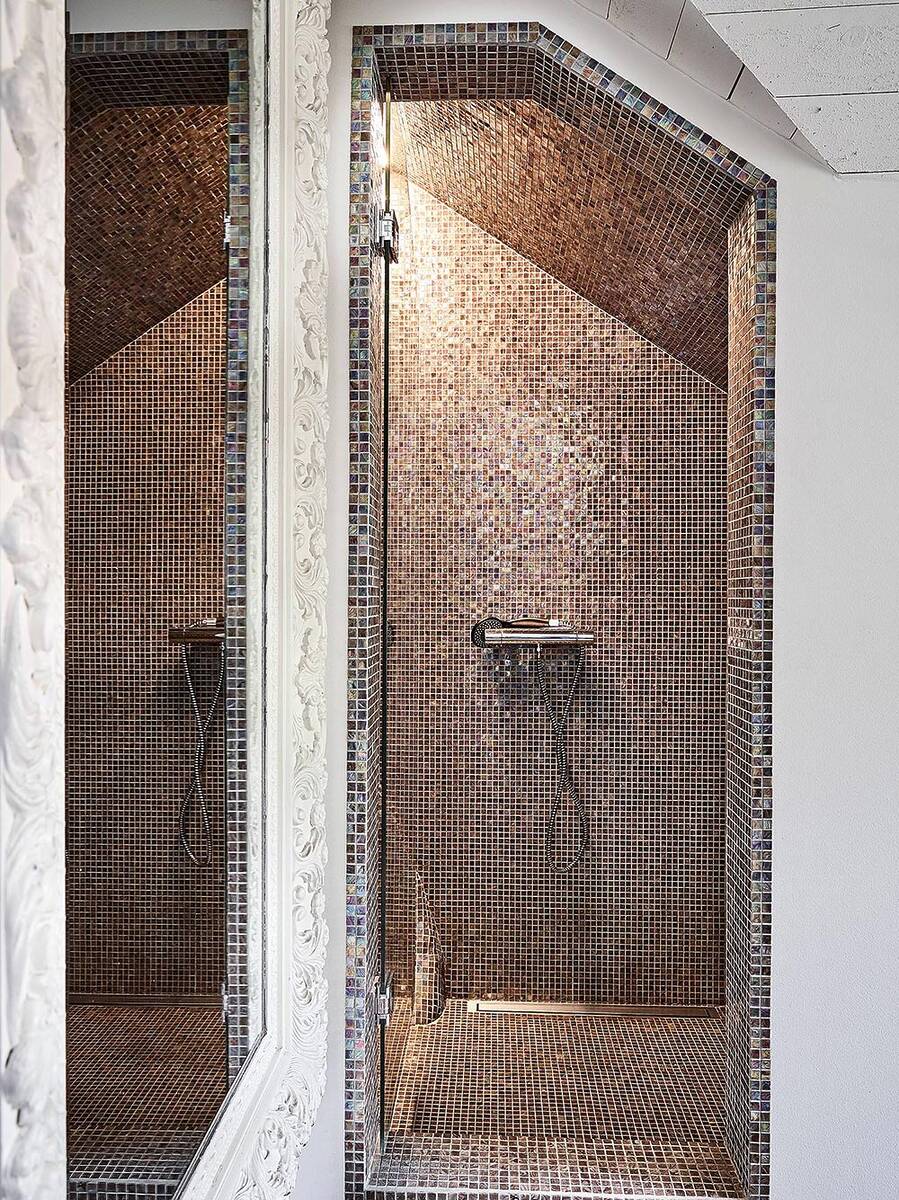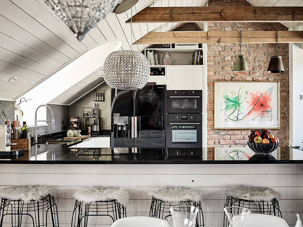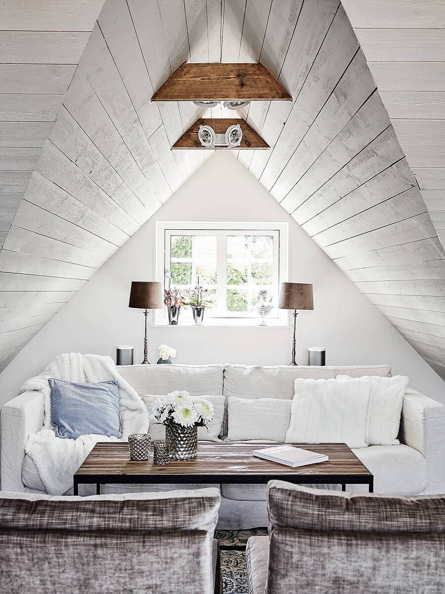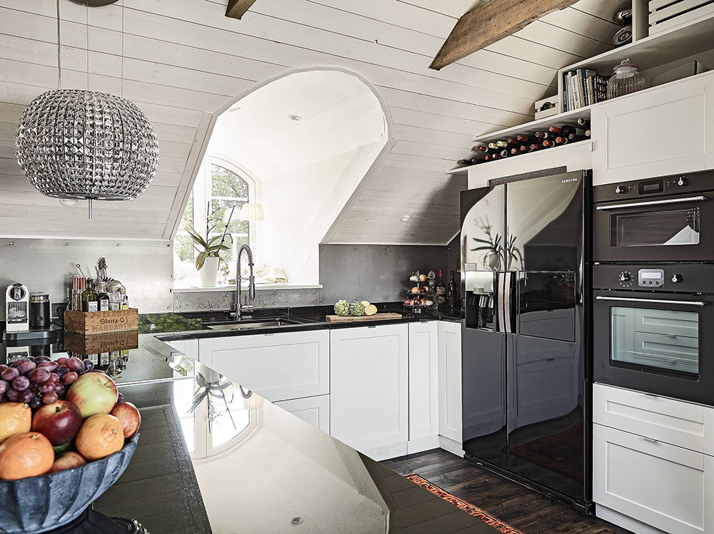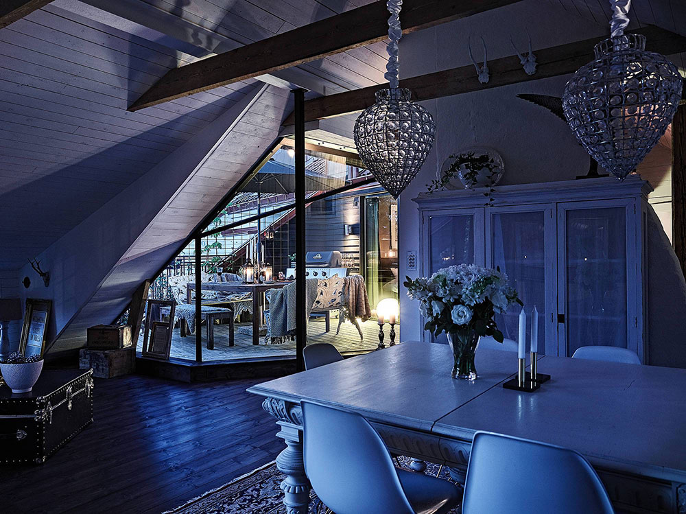 Напълно логично белият цвят е избран за основен на територията на този апартамент със скосен покрив. Бели тавани, стени и дървени ламперии се простират във всяка част на жилището. В унисон с тези конструкции на места се прокрадват тухлени и циментови акценти, както и масивни дървени греди. На този фон изключително интересно са вписани кристални полилеи, плюшени дамаски, декорации със златисто покритие и кресла с богата орнаментика. Внушителен и атрактивен винтидж декор.