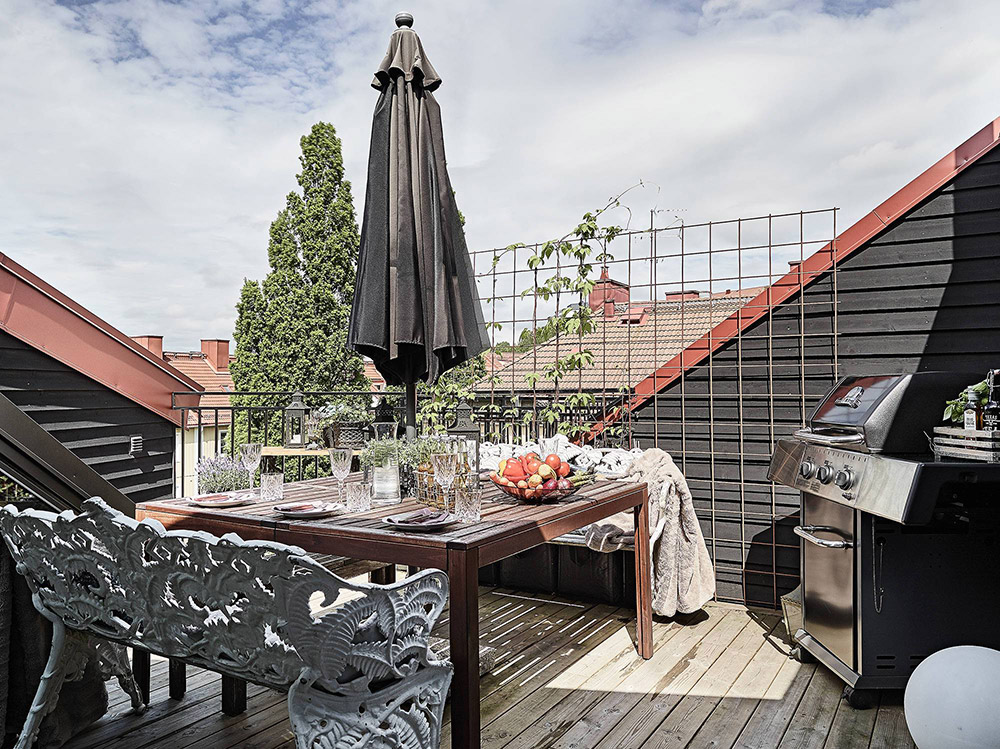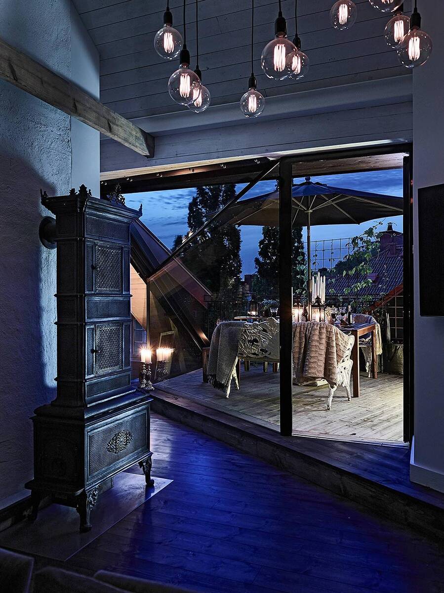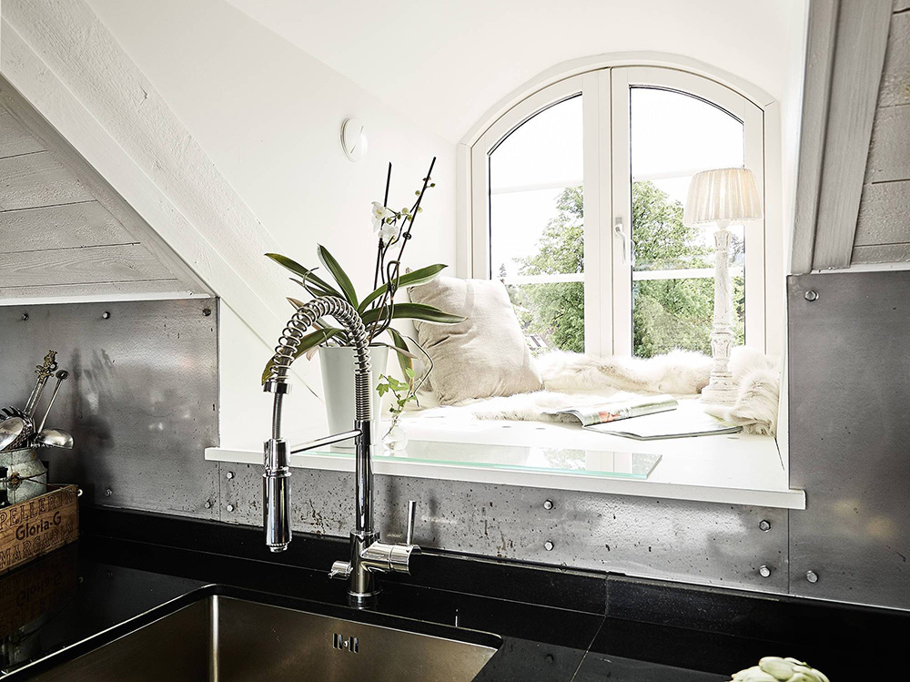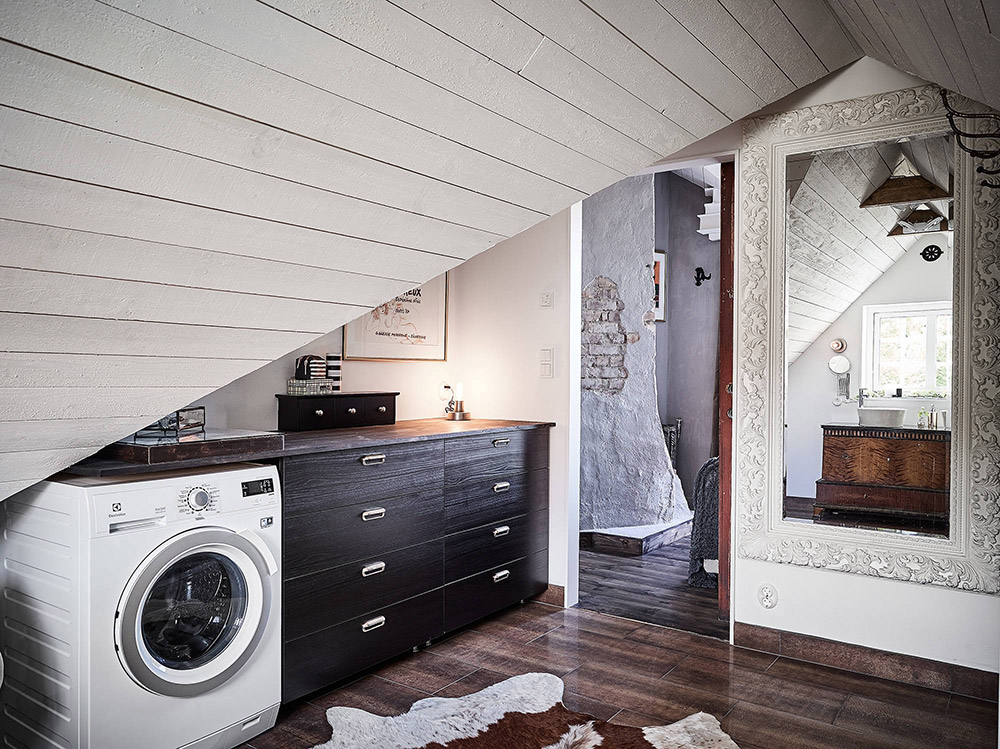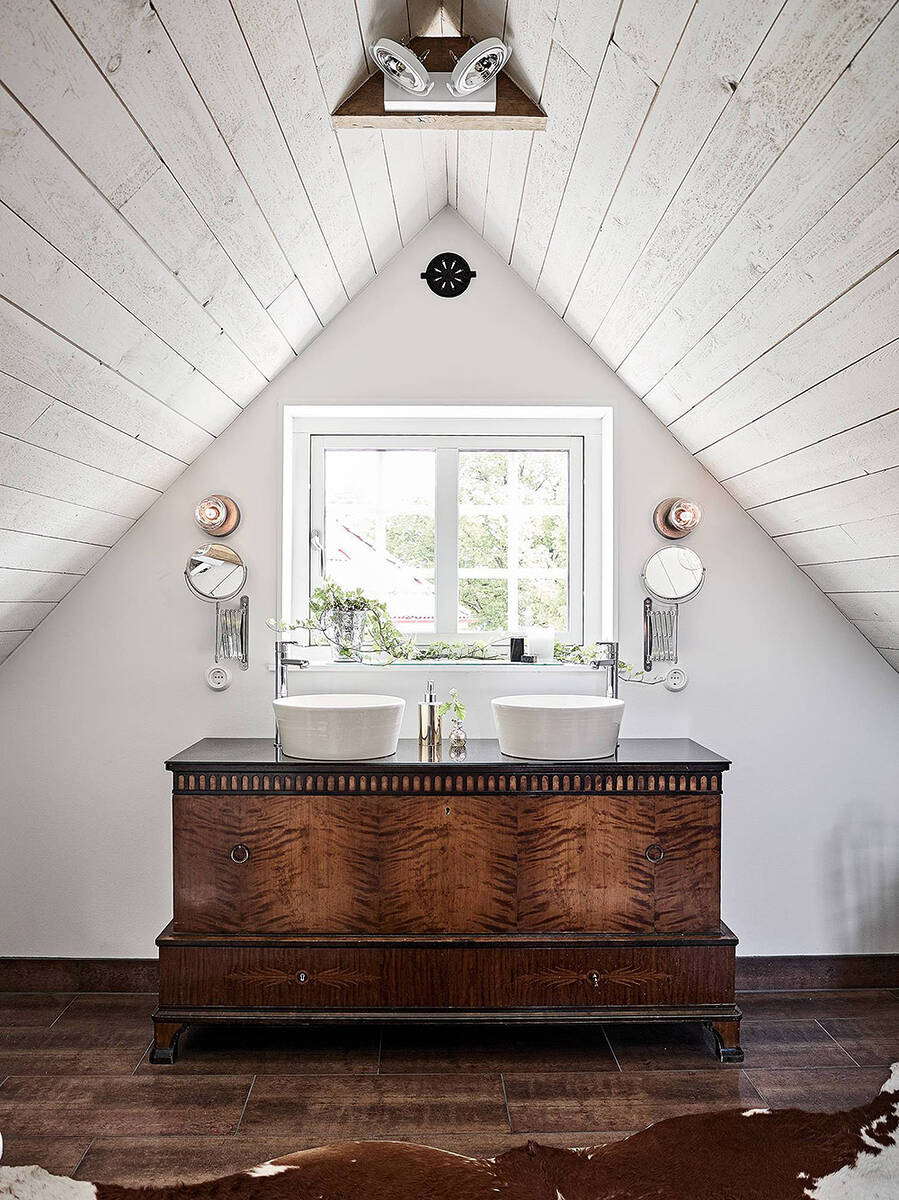 Напълно логично белият цвят е избран за основен на територията на този апартамент със скосен покрив. Бели тавани, стени и дървени ламперии се простират във всяка част на жилището. В унисон с тези конструкции на места се прокрадват тухлени и циментови акценти, както и масивни дървени греди. На този фон изключително интересно са вписани кристални полилеи, плюшени дамаски, декорации със златисто покритие и кресла с богата орнаментика. Внушителен и атрактивен винтидж декор.