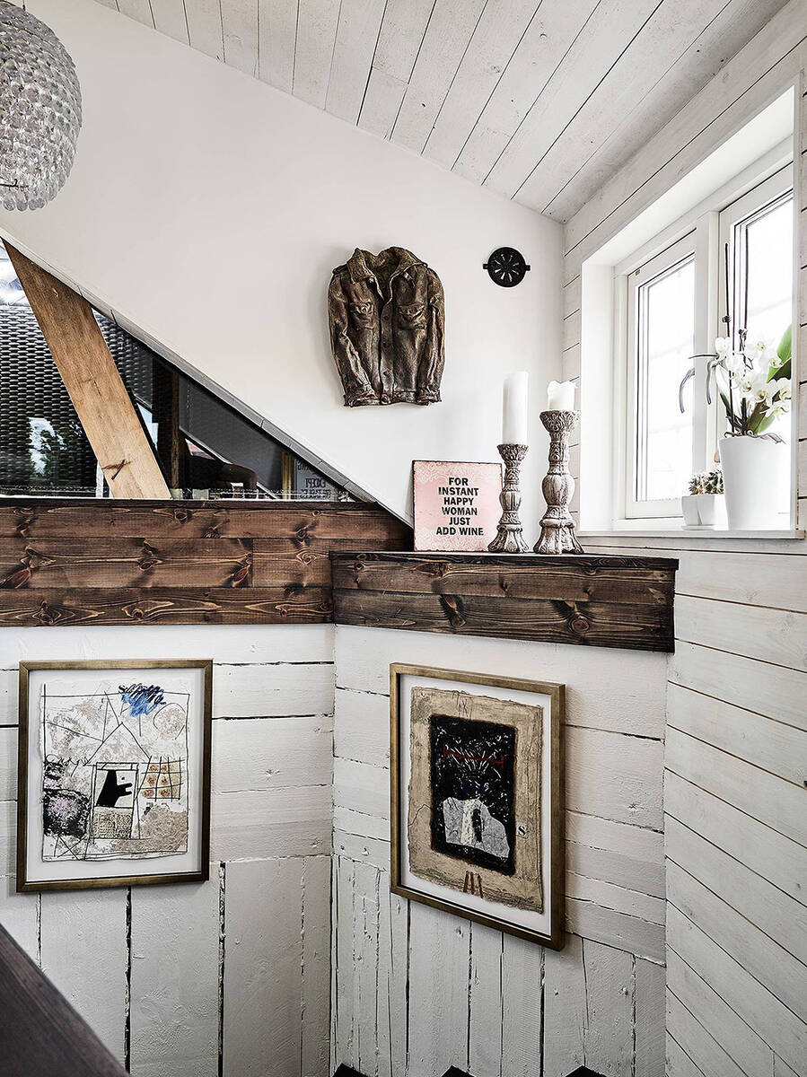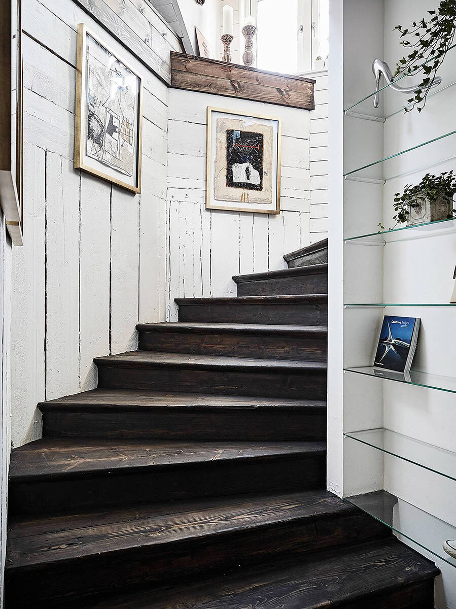 Стълбището на тази просторна мансарда е с особен принос за стилистиката на дома. Тясно и вито пространство, осеяно с изкуство, символизира особения прочит на съвременния дизайн.
