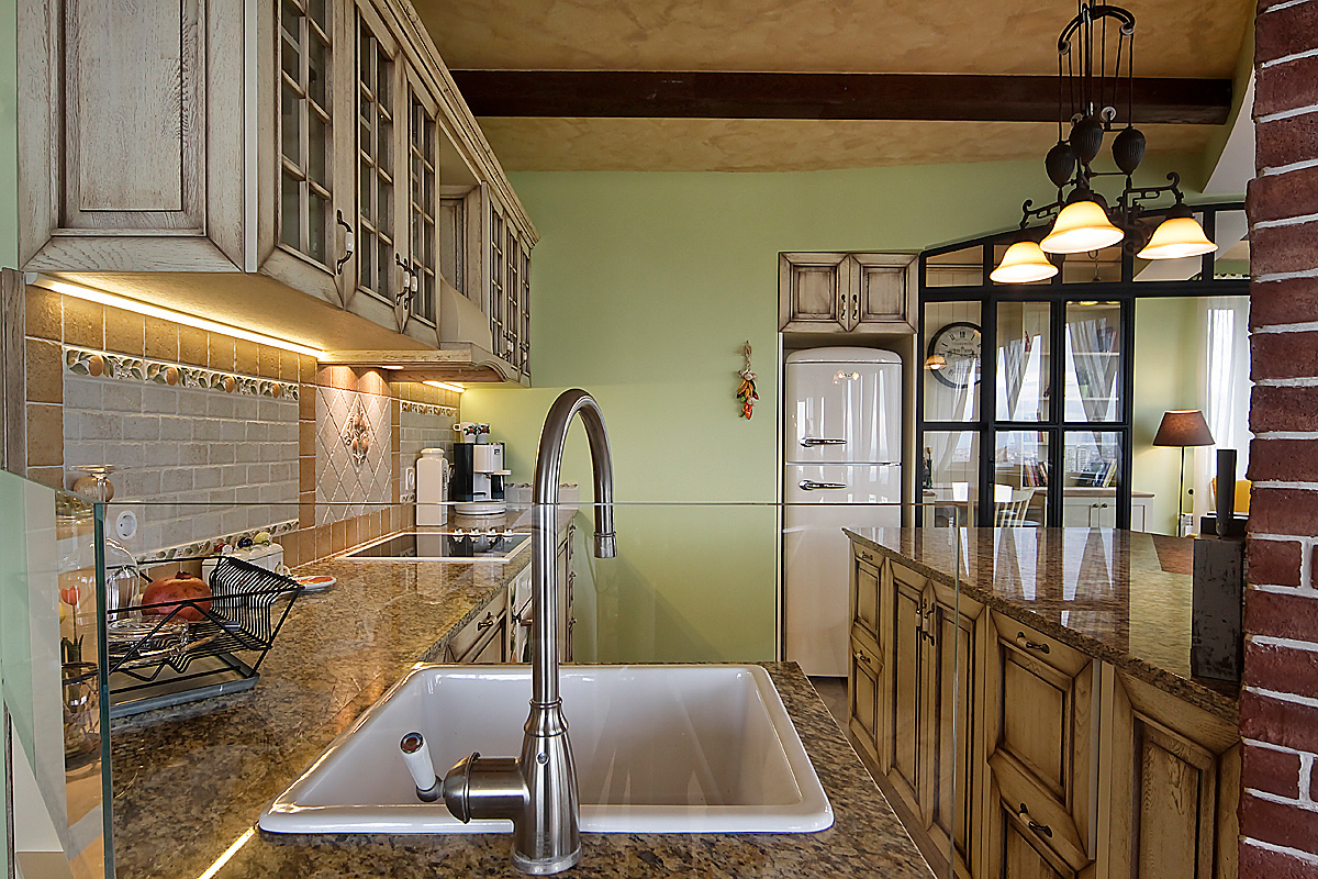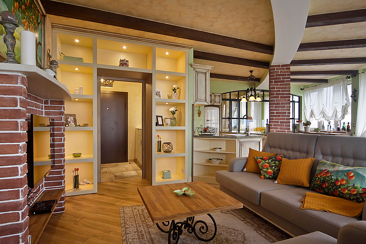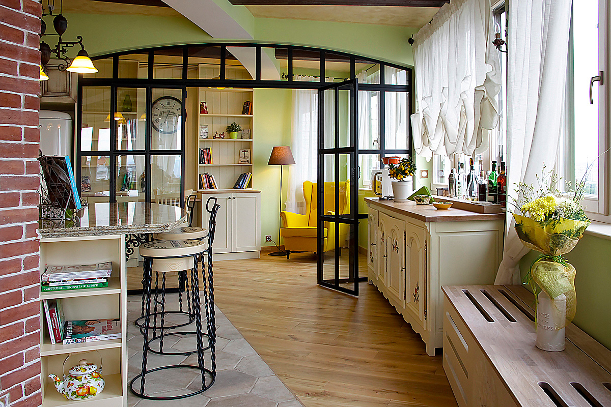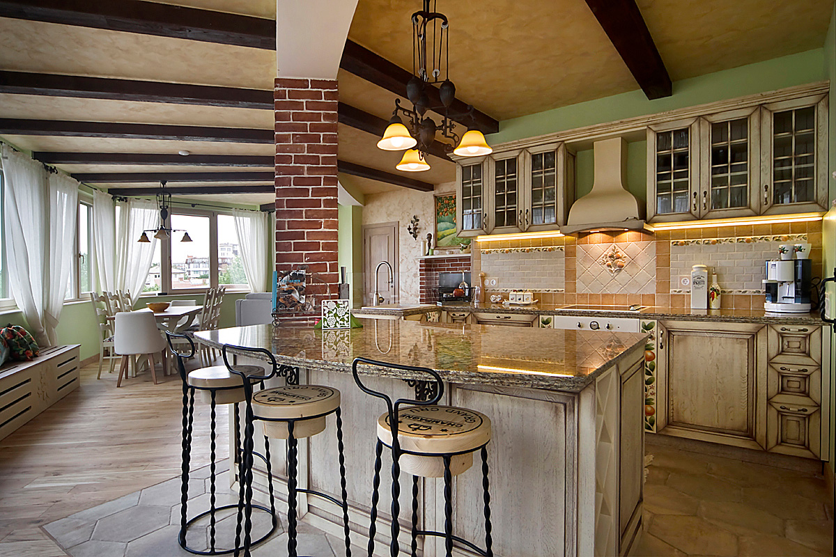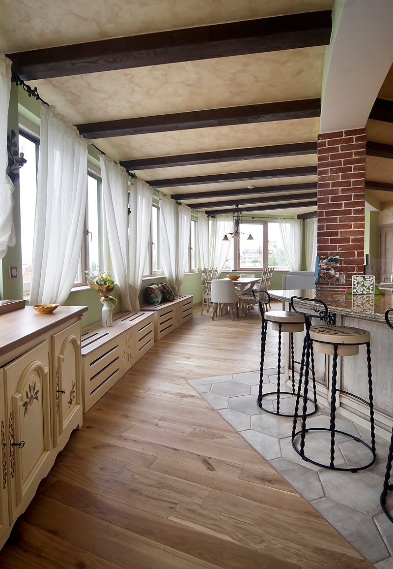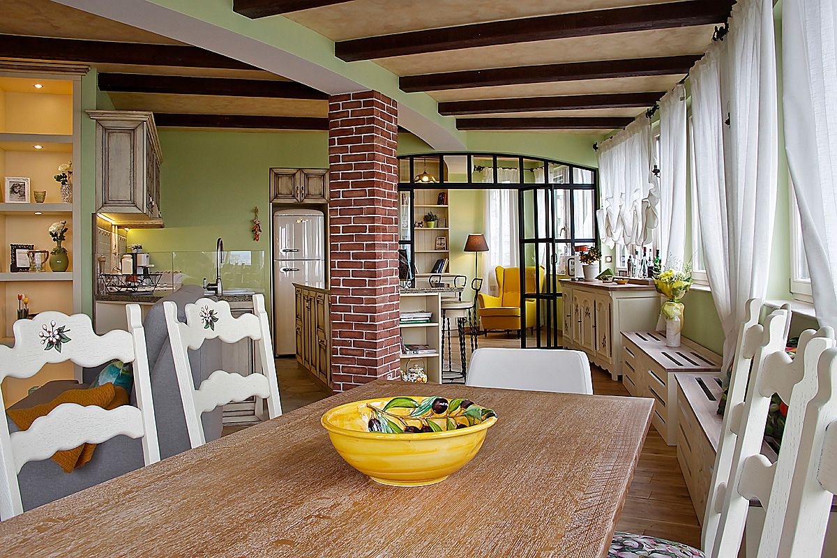 Стилистиката на тази мащабна дневна част от жилището е микс от естествени материали, материи, цветове и текстури. Част от елементите представят визията на къща в стил „Френски прованс” – естествен дъбов под и греди на тавана, стилни керамични плочки за пода и стената на кухнята, характерни цветове за средиземноморието и основния плодово-флорален мотив „Портокали и нероли”, който е пресъздаден чрез ръчно рисувана картина от художник-декоратор от екипа на „Студио Шкаф А”, чието дело са също така рисунките по кухненските шкафове, столовете в трапезарията, акценти от завесите и специален принт за завесите, дамаската и възглавниците.