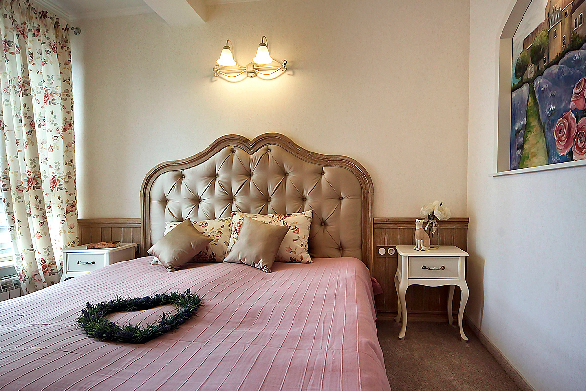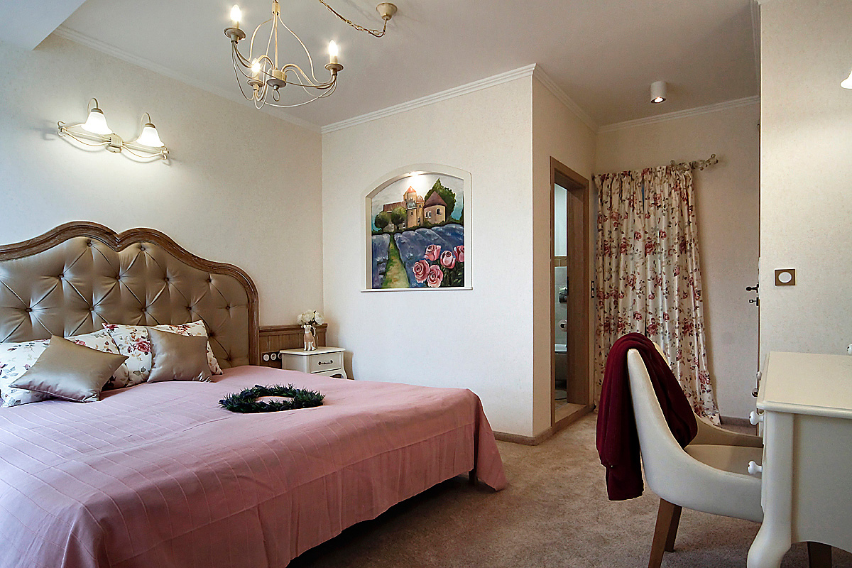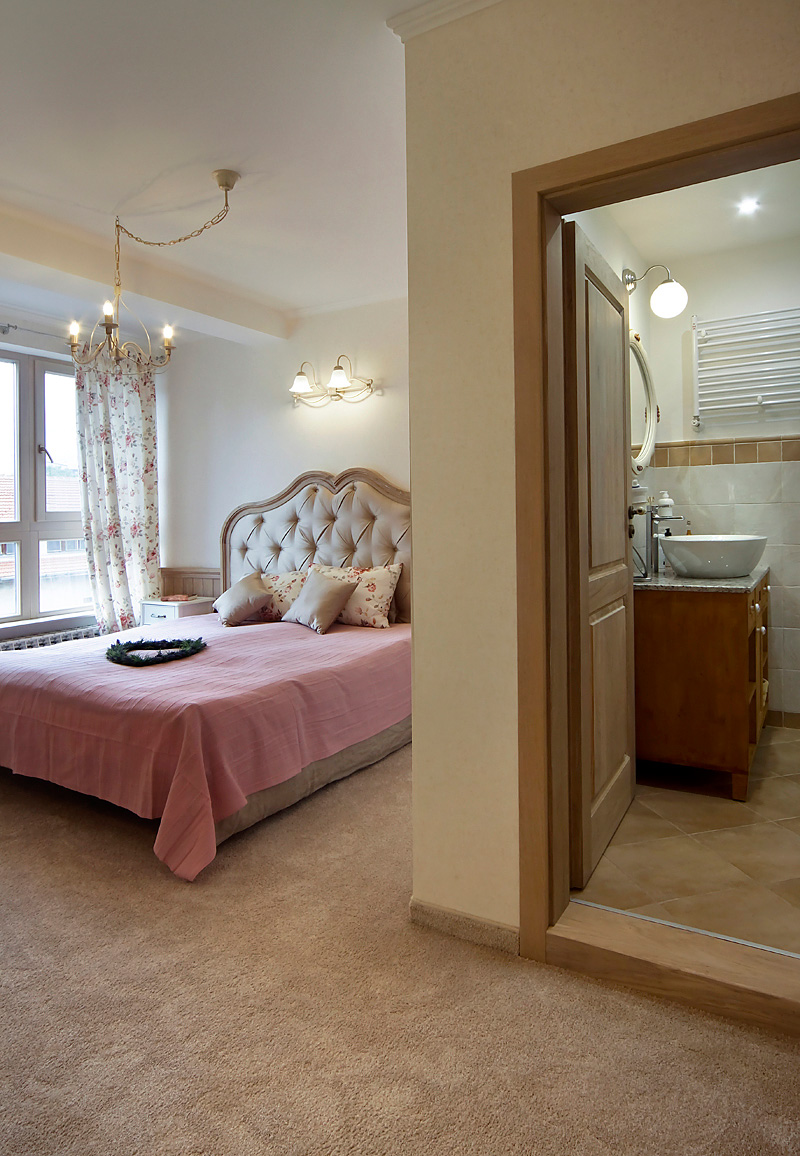– 1 спалня за родителите в семейството, с прилежащи баня с тоалетна и гардеробна стая. Тази стая е обзаведена и декорирана в основна линия „Прованс”, като специален акцент тук е картината, монтирана в ниша, която също е нарисувана от художник-декоратор, от екипа на студиото. Осветлението допълва цялостната визия на стаята, а банята е естествено елегантно продължение в същата мека тоналност.
