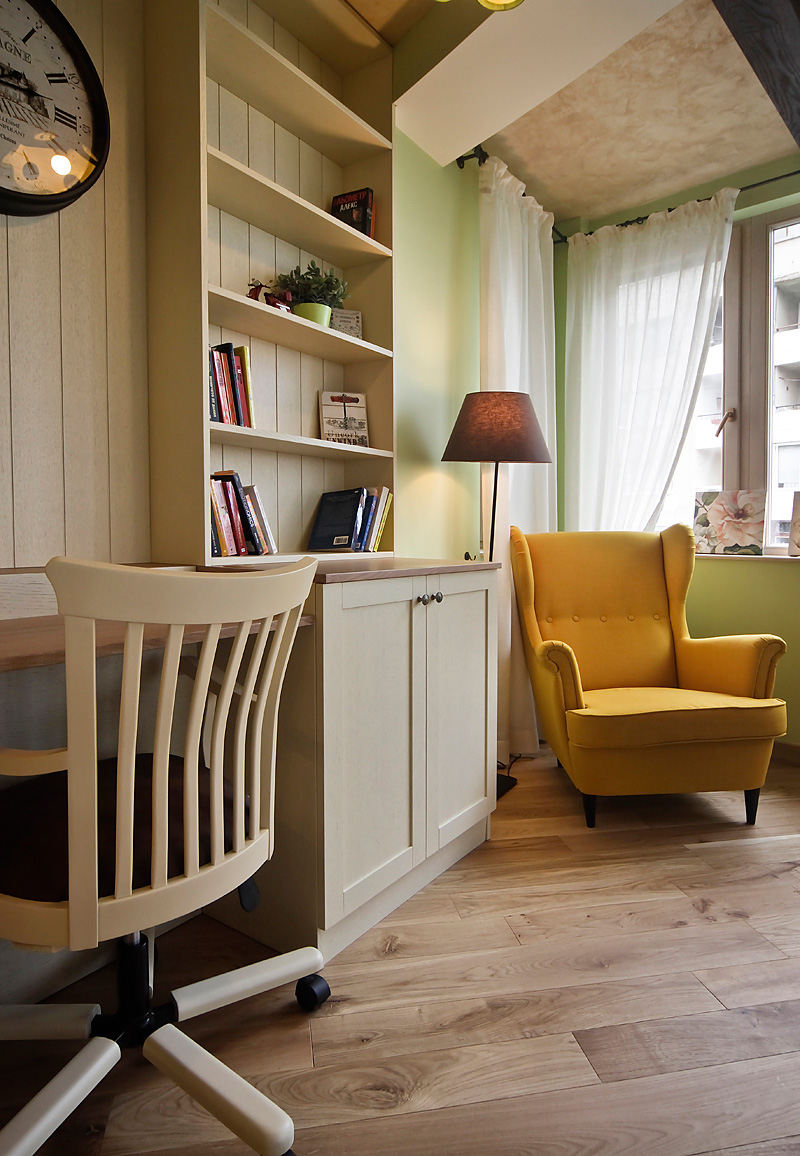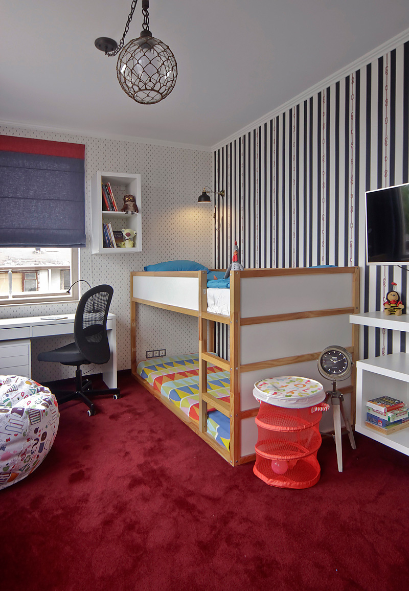 Показаната стая е обзаведена за детето на семейството, отново в миксиран стил, смесващ удобство, цветове и текстури, но тук превес в линията е градското удобство и семплата цветова гама на градско жилище, с леки цветни акценти, взаимствани от цветовете на Прованс. Втората детска стая не е показана, защото е определена за бъдещ нов член на семейството.