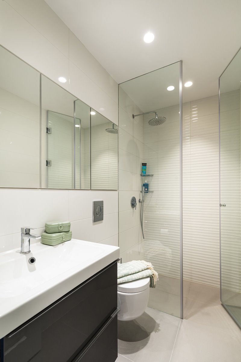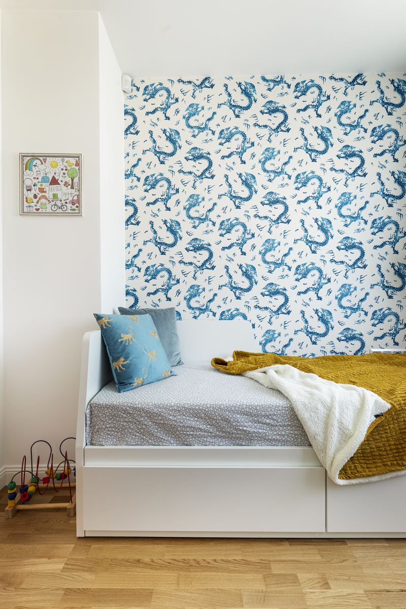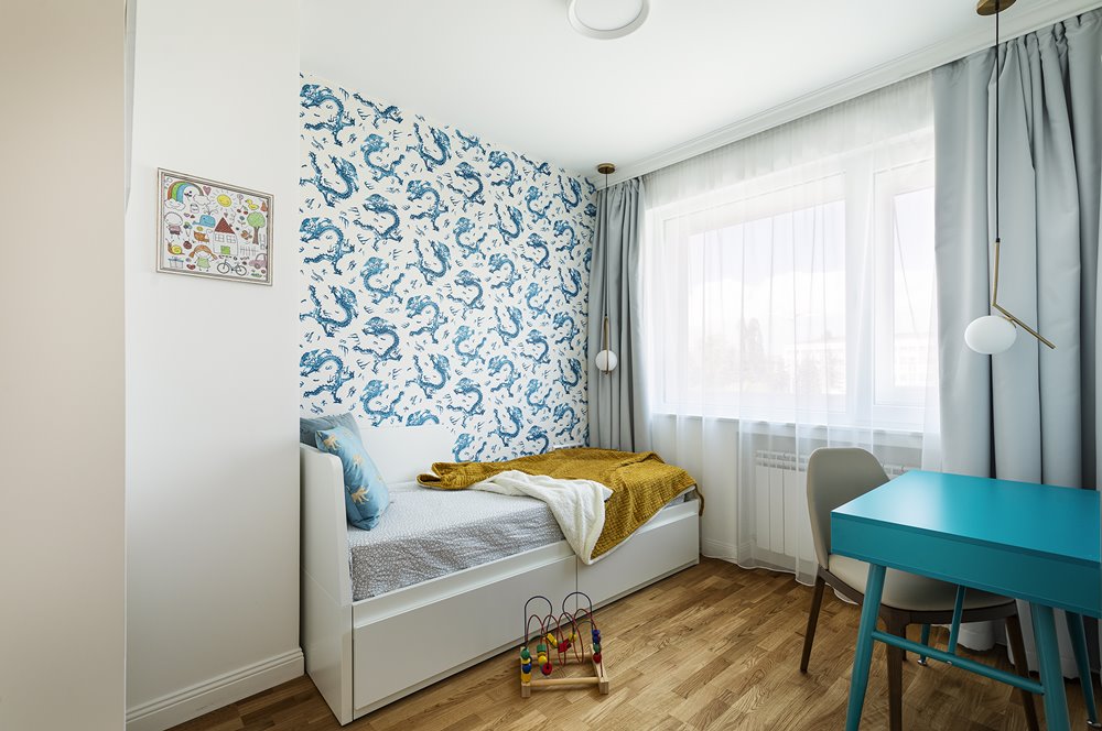 Към детската или гостната спалня е обособен дрешник, също както в основната. Тук цветовете са по-ярки и закачливи, като в същото време откриваме и елементи от дизайна присъстващи и в другите помещения.