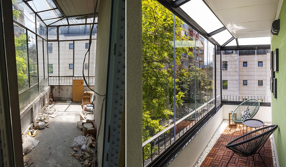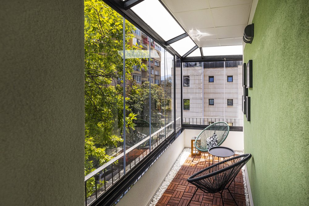 Финален щрих дизайнерите от COZY Design създават на терасата, която е напълно преобразена в малък оазис на спокойствието в градската среда. Остъкление от плъзгаща се алуминиева конструкция тип зимна градина, лесно превръща терасата от отворено пространство в затворено и обратното. Дървен декинг и модерни градински кресла подканват към чаша сутрешно кафе или ароматен чай насред разбуждащия се град.