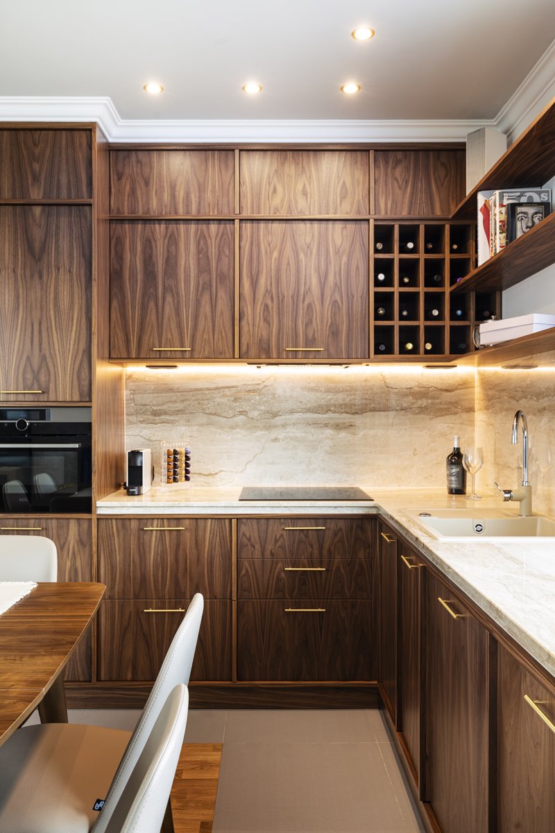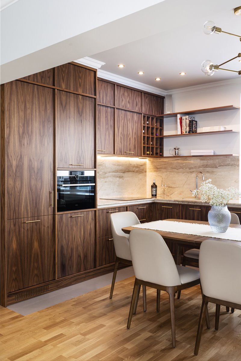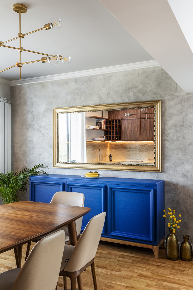 Всекидневната е мястото, където са направени промени по трегерната конструкция и пространството е отворено до 33 кв.м., за да може да побере в едно просторно помещение кухня с трапезария, зона за релакс и работен кът. Впечатляващите шкафове на кухнята са изработени с фурнир американски орех в комбинация с месингови елементи и вградени уреди. Тази част от помещението е допълнена от трапезен комплект в съчатание на орех и бежова кожа, а яркият син скрин на отсрещната стена се превръща в контрастен акцент, който завърша ансамбъла.