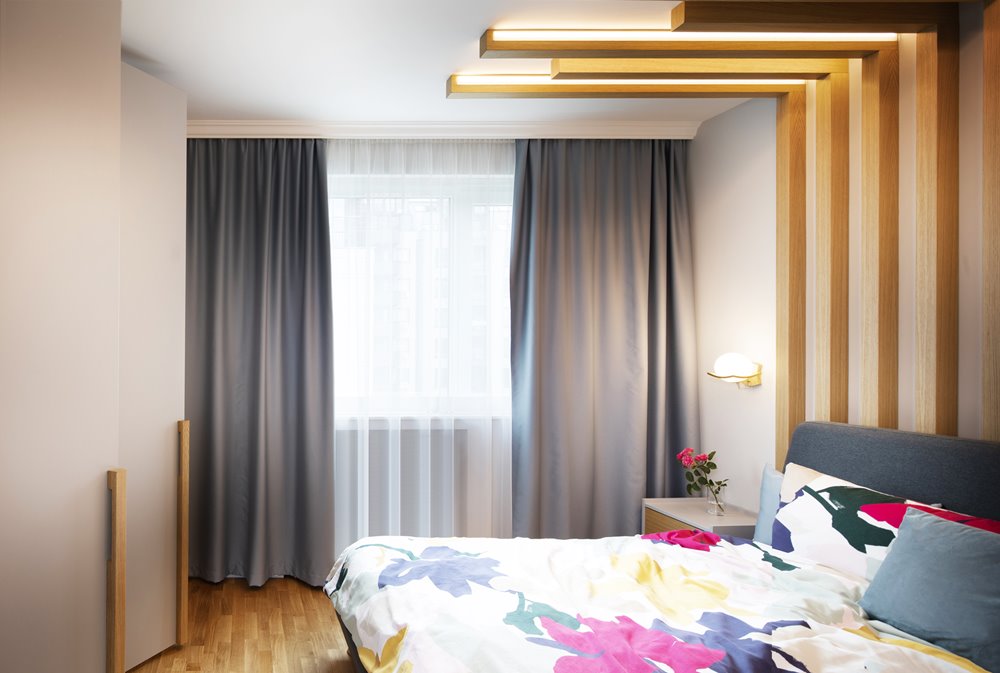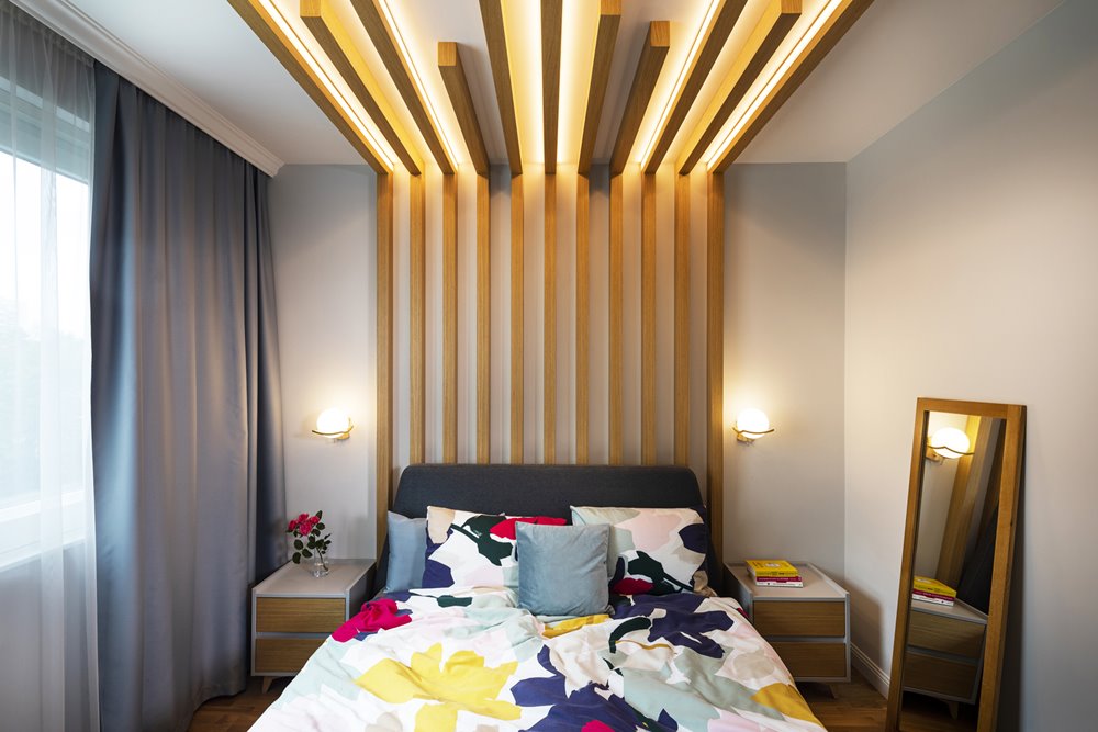Основната спалня е решена в по-модерен стил, като основен акцент пада върху уникалната пълзяща конструкция с вградено осветление, която преминава от стената зад леглото към тавана.