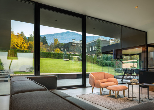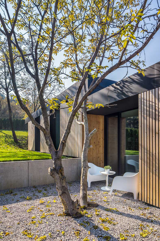 На първо време сме впечатлени от изчистената визия на дома. Къщата е разположена на хълмиста местност в близост до София, а проектанти са професионалистите от I/O Architects. Площта около постройката е засята с красив райграс, а стените от живи плетове около дома допълнително обогатяват зеленината в района. Това решение за жива ограда е отличен избор при нужда от уединение и неприкосновеност.