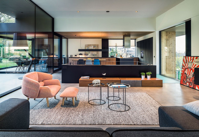Друга предпоставка за стилната атмосфера в тази съвременна къща е изборът на цветове. Предпочитанието на пастелни тонове в паралел с черно и бяло е страхотен избор за интериорен дизайн. Екстериорната визия е изцяло в черно и това взаимодействие на тонове не ни натоварва допълнително. Поглеждайки към зеленината отвън, картината се завършва окончателно.