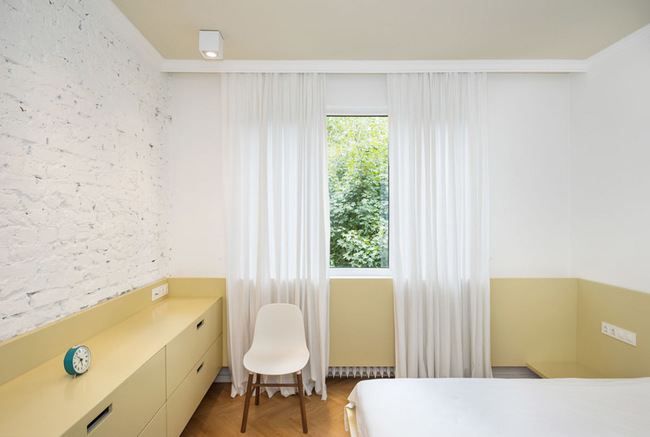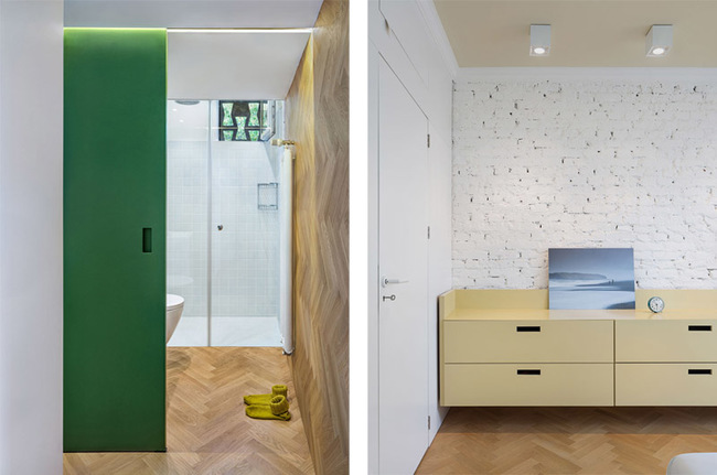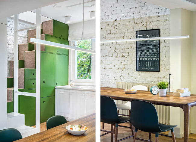 Този красив апартамент е решен с обща жилищна площ, включваща кухня, трапезария и хол. Дървени панелни врати делят пространството от вестибюла. Измазаните стени и частичното присъствие на тухлените орнаменти в бяло придават простор и съвременна визия на жилището. Фeеричните завеси и интересните форми на осветителните тела допълват усещането за уют в пространството.